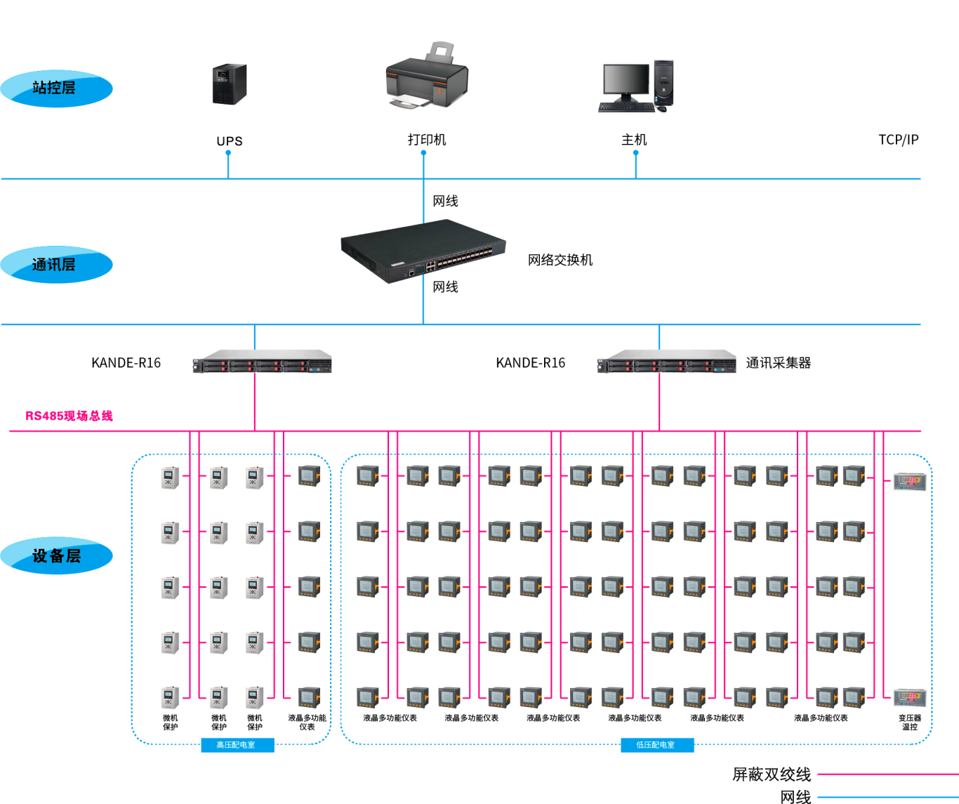 01系统结构描述本项目采用KANDE-2000电力监控系统,主要实现对江苏和成新材料有限公司配电房内的微机保护、多功能仪表、变压器温控进行监控分析,监控主机位于配电房内值班室,监控主机与各通讯采集器之间通过网线连接,各多功能仪表、微机保护、变压器温控之间通过屏蔽双绞线以手拉手的方式连接至通讯采集器,不同的仪表分开来拉线。