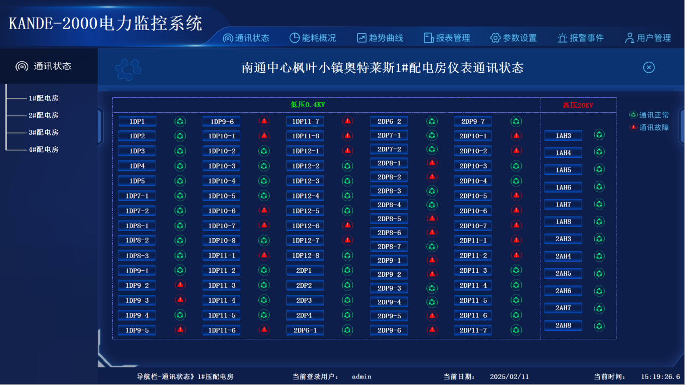 点击顶部通讯状态,然后在左侧导航栏中选择高低压配电房进入通讯状态图。