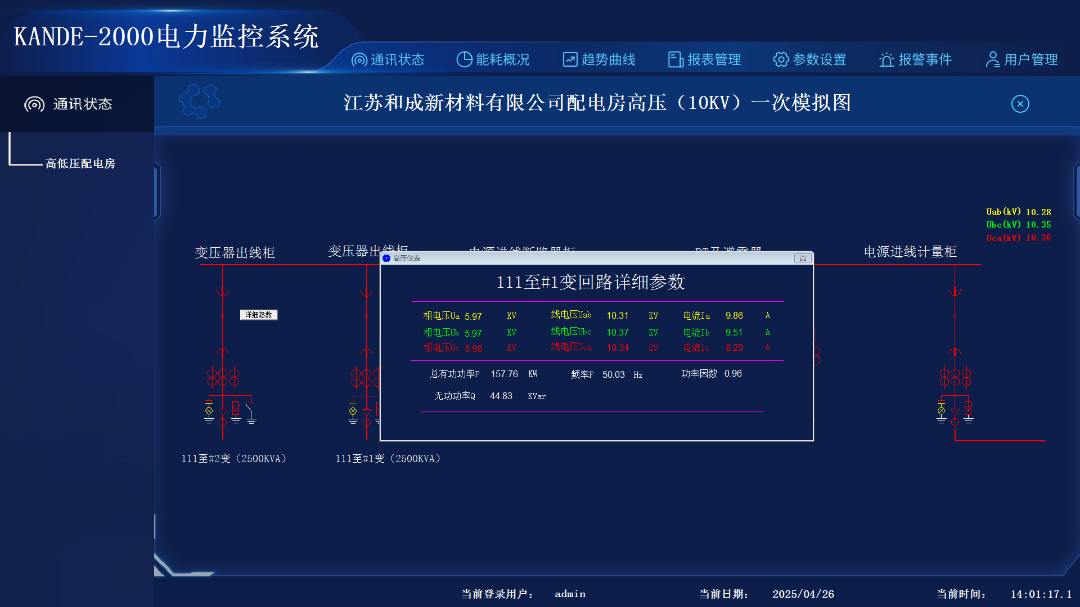 一次图中的各个回路显示遥测电流值,详细电压、电流、功率、电能值点击各回路即可看到,界面显示数值均为实时数值。