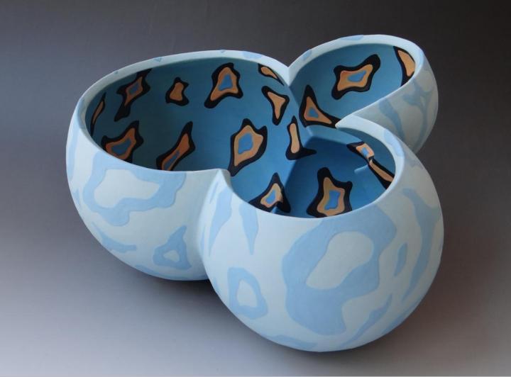 以大胆的几何抽象风格突破传统陶艺的边界,明快的色彩碰撞与利落的线条运用让他的作品充满先锋感与实验性。他解构传统陶艺的形态束缚,使陶瓷成为探讨“形态与功能”“传统与未来”的艺术媒介,展现出对当代艺术语言的独特探索。