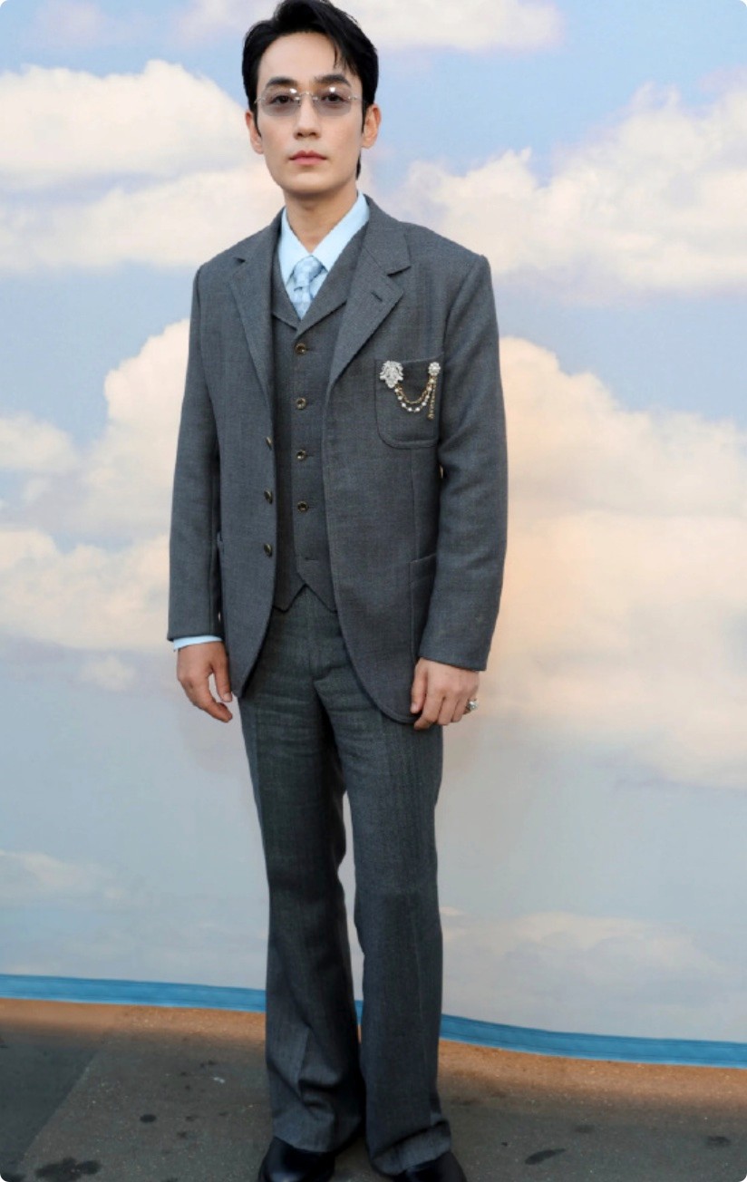 他穿着一身灰色西装,剪裁流畅,风格雅痞,既有绅士味也有少年感。