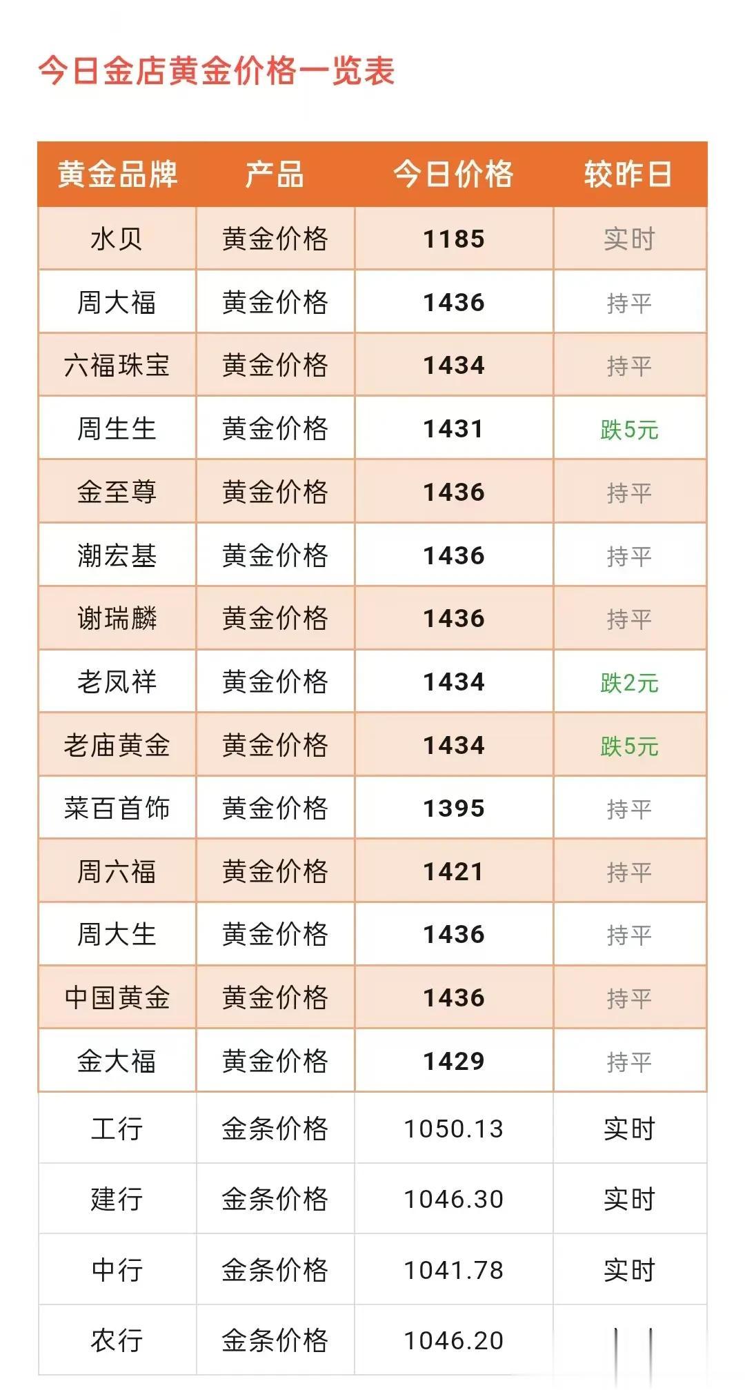 周大福黄金价格1436元/克,六福珠宝黄金价格1434元/克,周生生黄金价格1431元/克,老凤祥黄金价格1434元/克,老庙黄金黄金价格1434元/克。