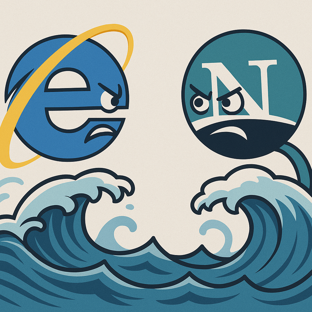 IE 与网景之争 20 世纪 90 年代,网景(Netscape)与微软 IE 打响了第一场“浏览器战争”。那时,浏览器几乎等同于互联网入口,谁控制了浏览器,谁就把握了用户的上网方式。微软凭借 Windows 预装优势,击败网景,IE 一度占据 90% 以上市场份额。