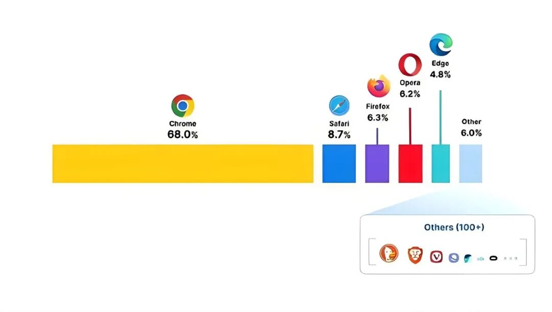 Firefox 与 Chrome 的崛起 2000 年后,Firefox 以开源精神赢得一批极客用户,但真正改写格局的是谷歌 Chrome。2008 年发布的 Chrome,凭借极简设计与极速体验,迅速超越 IE 与 Firefox。到 2015 年,Chrome 已成为全球第一浏览器,市场份额稳居 60% 以上。