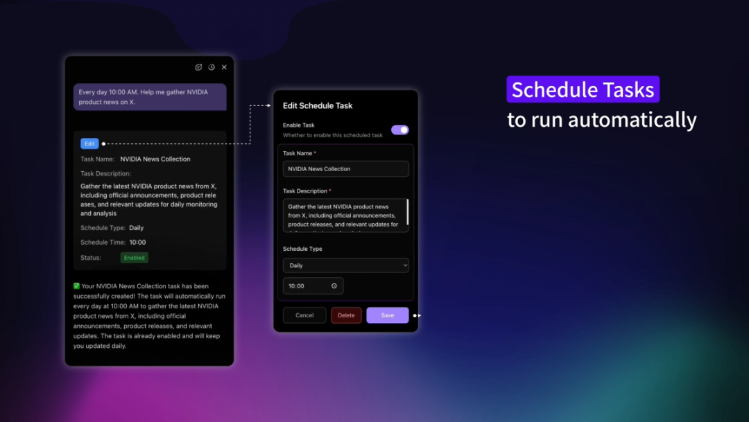 定时任务:按设定自动生成日报/周报、会前资料汇总、财务对账草稿;