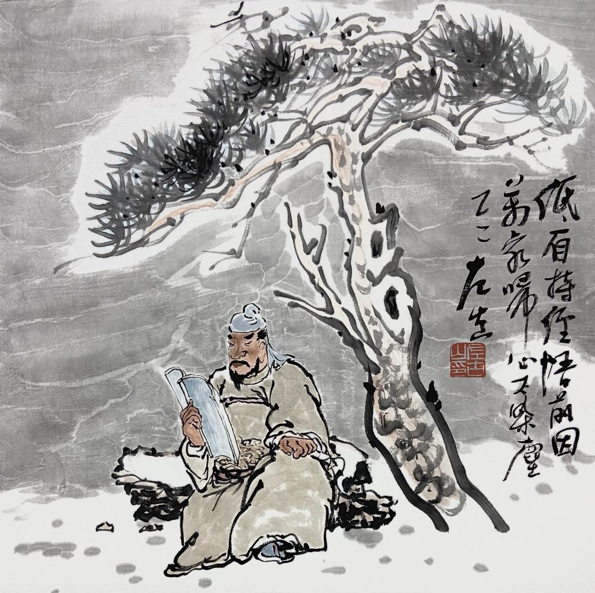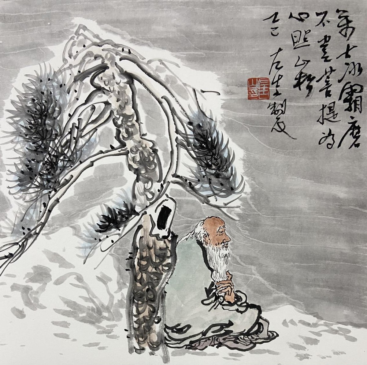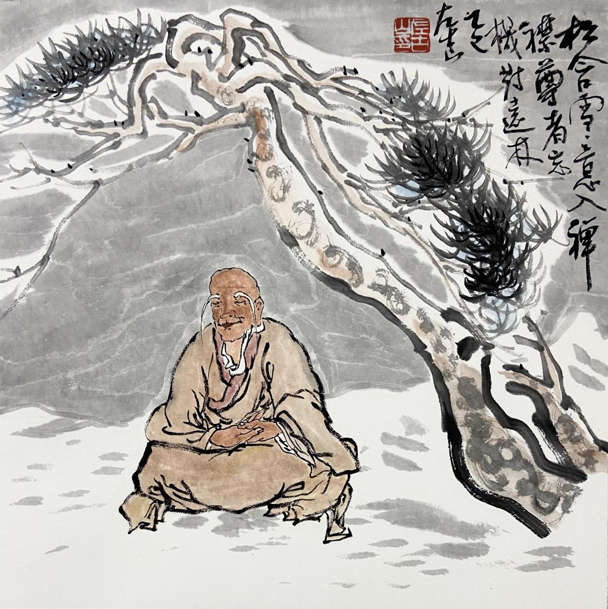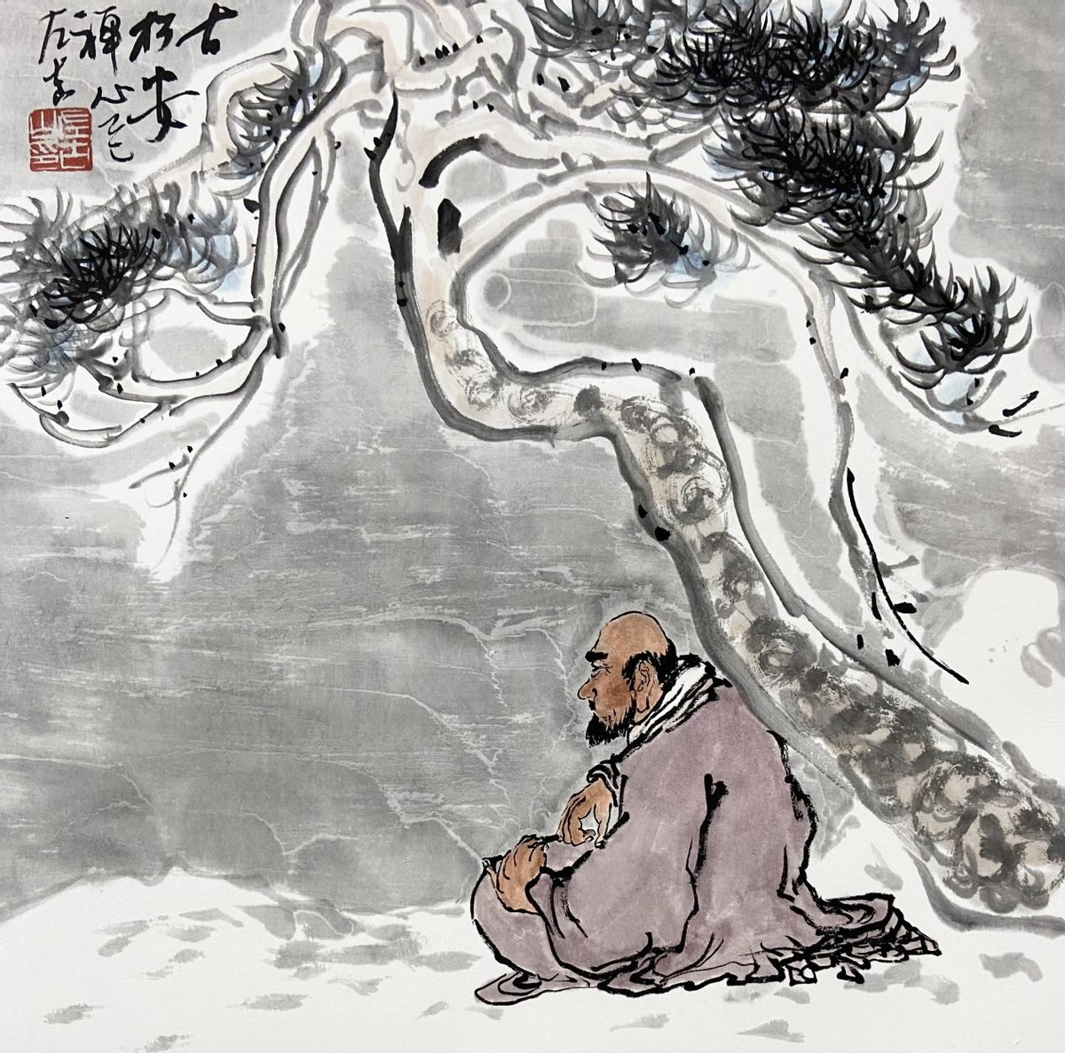 2025年世博会荣获金奖作品《静坐参妙理》是左古山艺术理念的集中呈现。画作以传统松题材为核心骨架,以静坐悟道为精神内核,在笔墨语言上既恪守骨法用笔、气韵生动的传统法度,又在构图与意境营造上实现当代创新。画面简淡空灵、静穆大气,于笔墨虚实之间,呈现出天人合一、内观自省的东方哲思,既有文人画的清雅格调,亦具备面向世界的艺术感染力,实现了传统文脉与当代审美理念的有机统一。