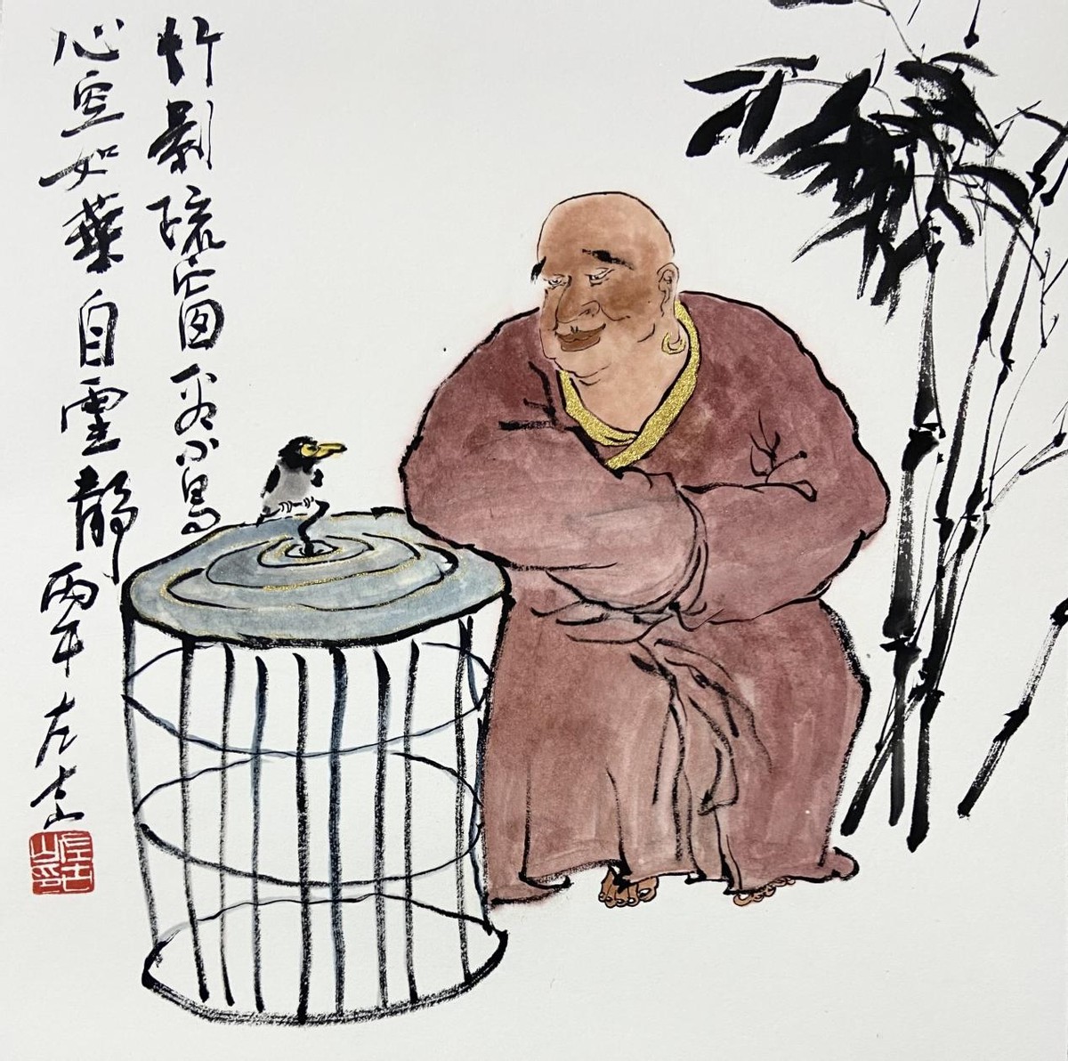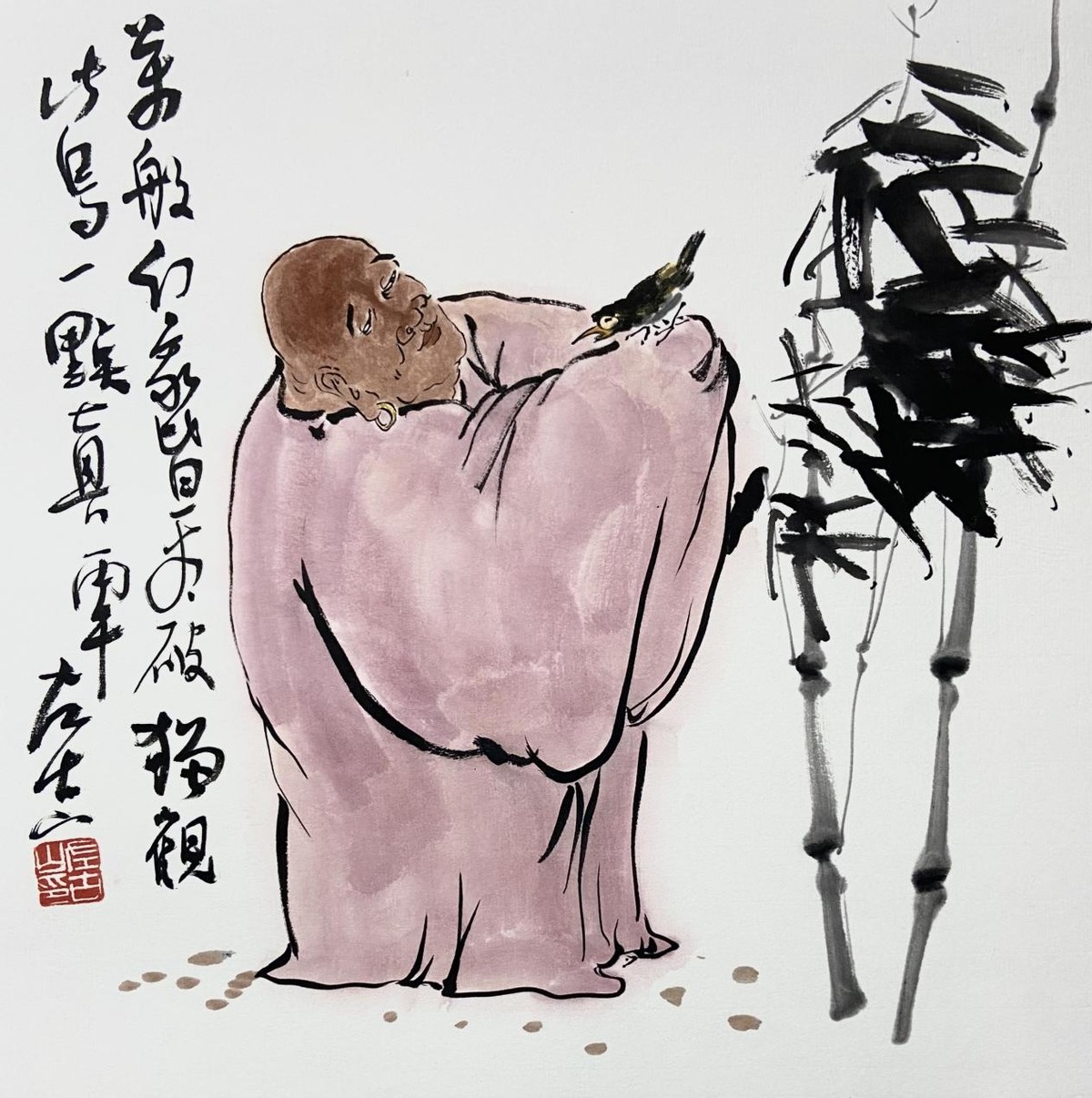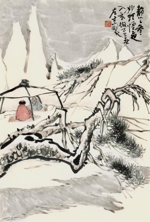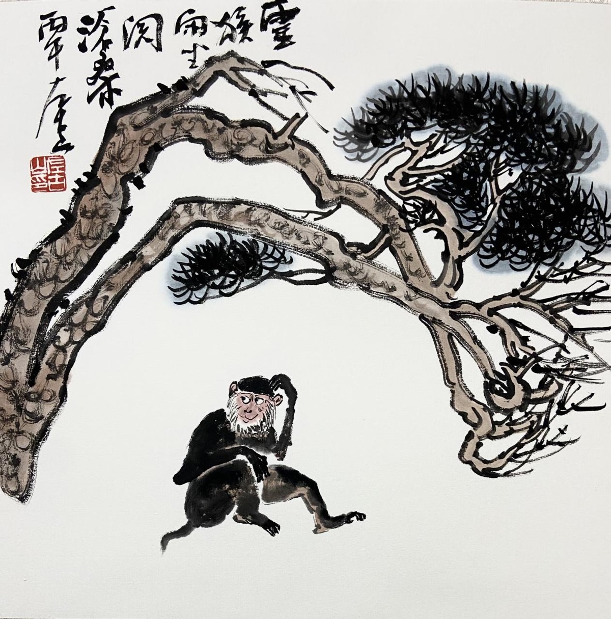 2025年世博会荣获金奖作品《静坐参妙理》是左古山艺术理念的集中呈现。画作以传统松题材为核心骨架,以静坐悟道为精神内核,在笔墨语言上既恪守骨法用笔、气韵生动的传统法度,又在构图与意境营造上实现当代创新。画面简淡空灵、静穆大气,于笔墨虚实之间,呈现出天人合一、内观自省的东方哲思,既有文人画的清雅格调,亦具备面向世界的艺术感染力,实现了传统文脉与当代审美理念的有机统一。