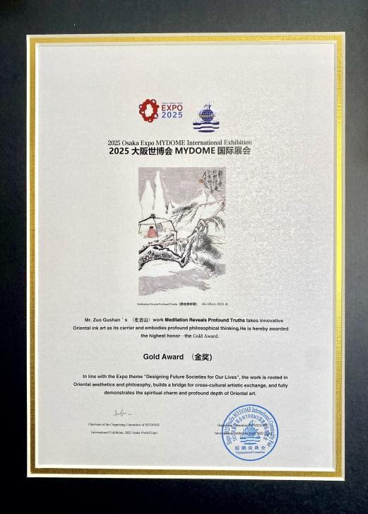 2025大阪世博会MYDOME国际展会,汇聚了世界多国艺术家的精品力作,评审环节严格围绕艺术水准、文化内涵、时代价值与创新表达展开。左古山先生的《静坐参妙理》凭借成熟的艺术语言与深邃的精神境界获得评审团一致肯定,组委会正式授奖评语为:Mr. Zuo Gushan’s(左古山) work Meditation on the Profound Truth(《静坐参妙理》) takes innovative Oriental ink art as its carrier and embodies profound philosophical thinking. He is hereby awarded the highest honor—the Gold Award(金奖).In line with the Expo theme "Designing Future Societies for Our Lives", the work is rooted in Oriental aesthetics and philosophy, builds a bridge for cross-cultural artistic exchange, and fully demonstrates the spiritual charm and profound depth of Oriental art.(左古山先生作品《静坐参妙理》以创新东方水墨艺术为载体,蕴含深邃哲思,特授予最高奖项金奖。作品契合世博会“设计未来社会,让生命绽放光彩”主题,植根东方美学与哲学思想,搭建跨文化艺术交流桥梁,充分展现东方艺术的精神魅力与深厚底蕴。)