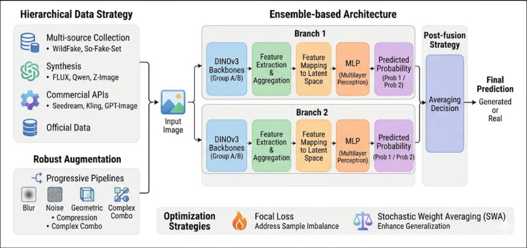 高质量且多维的数据集是打破过拟合的基石。团队依托深厚的数据积累,构建了包含数百万样本的复杂训练语料库,层次化覆盖四类数据来源:开源学术基准、主流开源生成模型定向合成、商业闭源 API 高保真样本,以及比赛官方数据,确保对当前主流生成生态的全面覆盖。