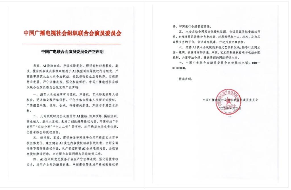 中国广播电视社会组织联合会演员委员会于 4 月 2 日发布严正声明,强烈谴责 AI 换脸、素材滥用及违规训练 AI 模型等行为,发出行业警告:严守法律底线,捍卫视听真实。