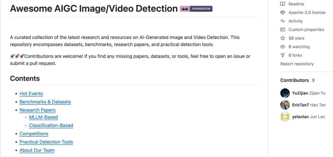 这个仓库整合了最新的热点事件、前沿论文、基准数据集及实用工具,为全球研究人员提供了一个技术参考的宝贵资源。团队将持续更新,确保资源的时效性与前沿性,以应对 AI 生成内容带来的挑战。