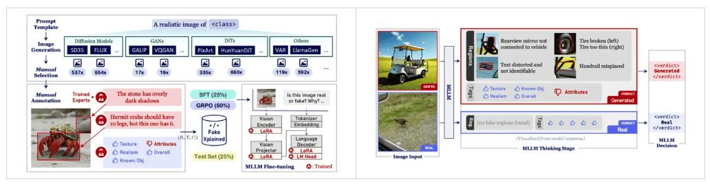 一个是跨域泛化能力不足。不同生成架构(如扩散模型、自回归模型等)和闭源商业平台的生成机制差异巨大,伪影特征也随之变化。传统检测模型常常对单一训练数据过拟合,一旦遇到新的生成体系,便容易失效,难以识别新型伪造内容。