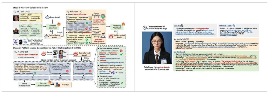 Veritas 框架便是这一努力的具体体现。通过结合多模态大语言模型( MLLM )和模式感知推理( Pattern-aware Reasoning )机制,团队突破了传统大模型纯文本思维链的限制,使得模型在面对未知生成器时,能展现出更强的适应性和推理能力。