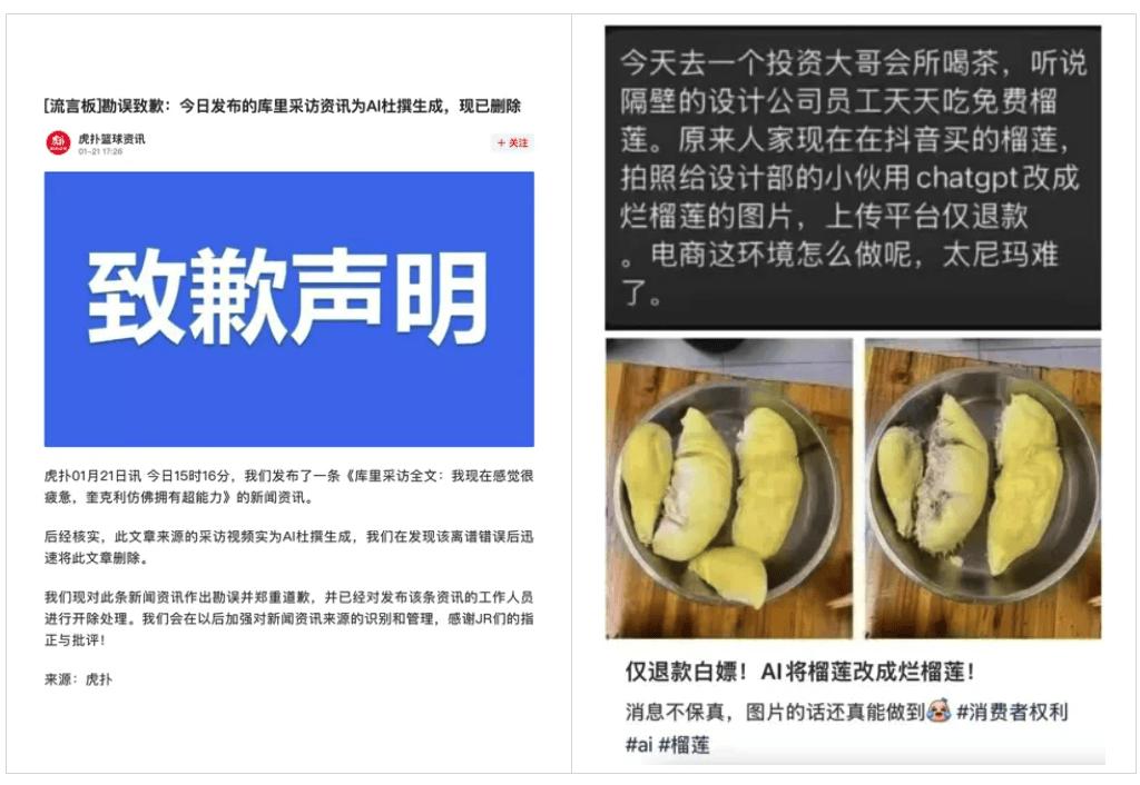 更为严重的是,深度伪造技术滥用的风险急剧上升——从库里采访的 AI 杜撰事件,到 AI 生成的假水果图骗取退款,这些乱象正在严重挑战社会信任和内容平台的生态。