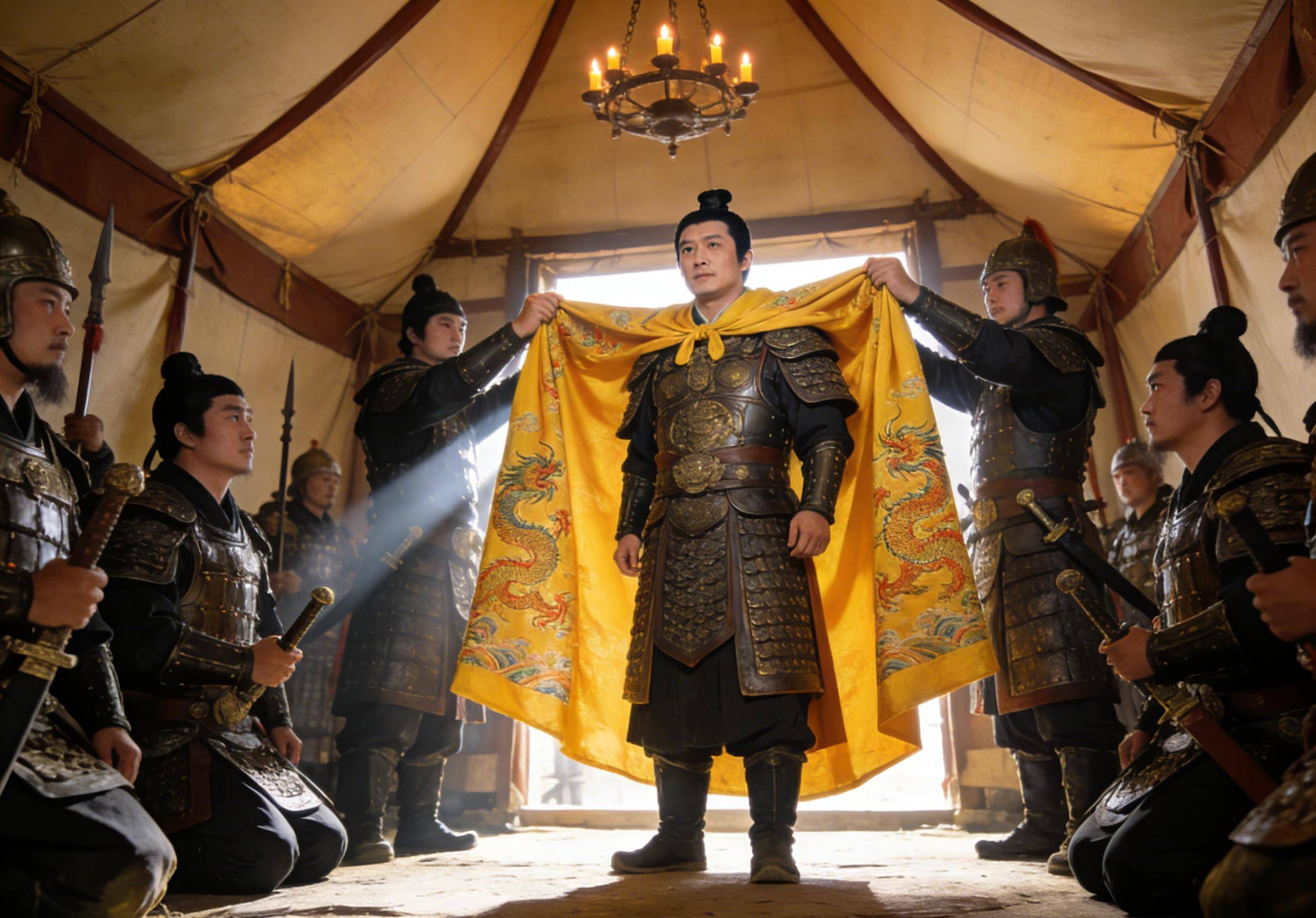 当晚,在赵匡胤的弟弟赵光义和亲信赵普的策划下,将士们纷纷议论:“主上幼弱,我等出死力破敌,谁则知之!不如先立点检为天子,然后北征”。第二天清晨,众将手持黄袍闯入赵匡胤帐中,将黄袍披在他身上,随即跪拜高呼“万岁”。