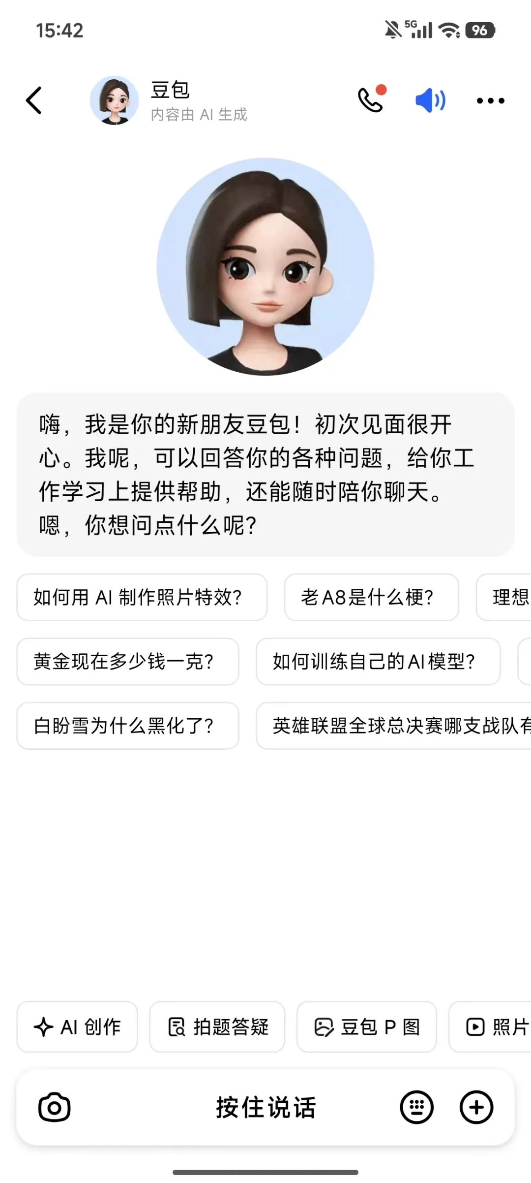 豆包则更强调AI 助手的拟人属性。点开豆包默认会开启语音朗读,输入框也是默认语音输入,右上角的电话红点则引导用户与 AI 语音聊天。