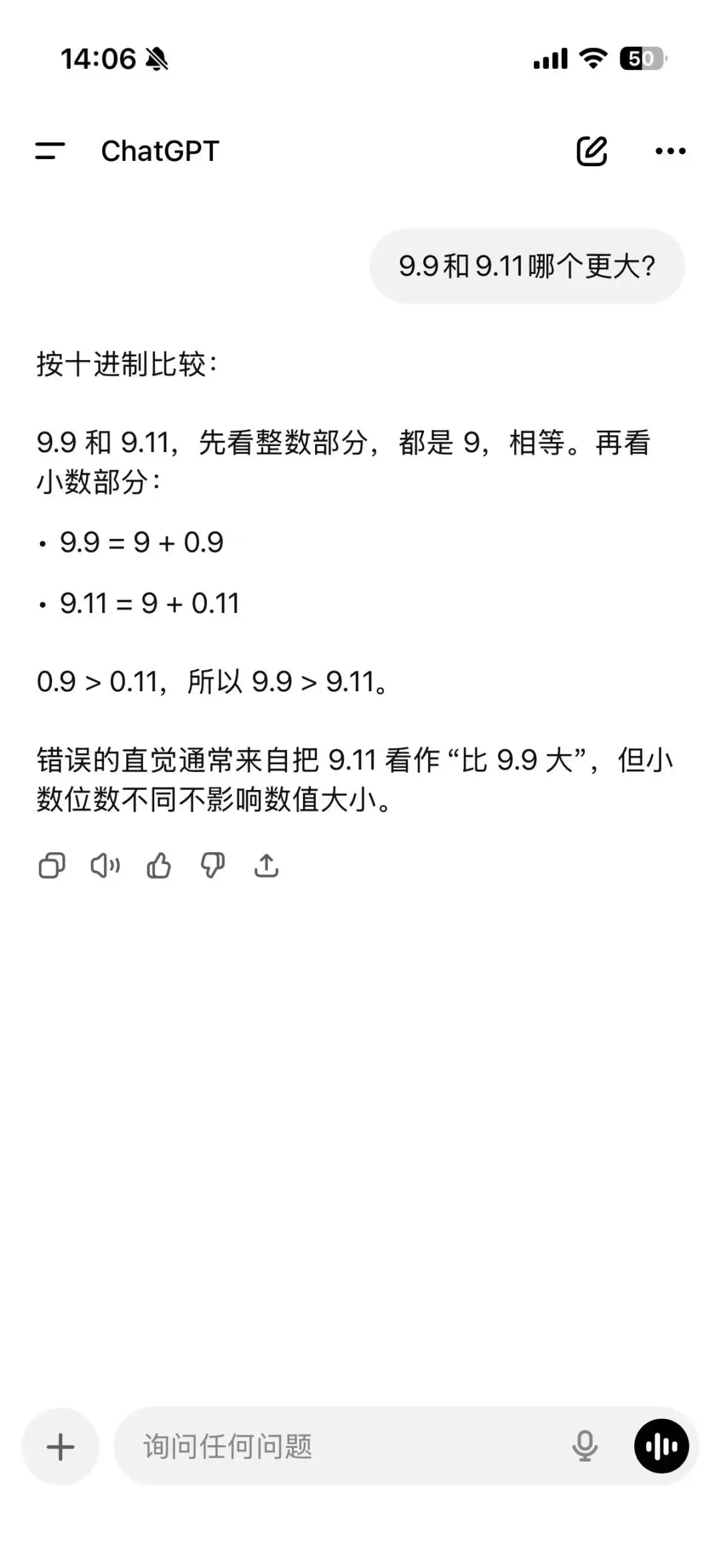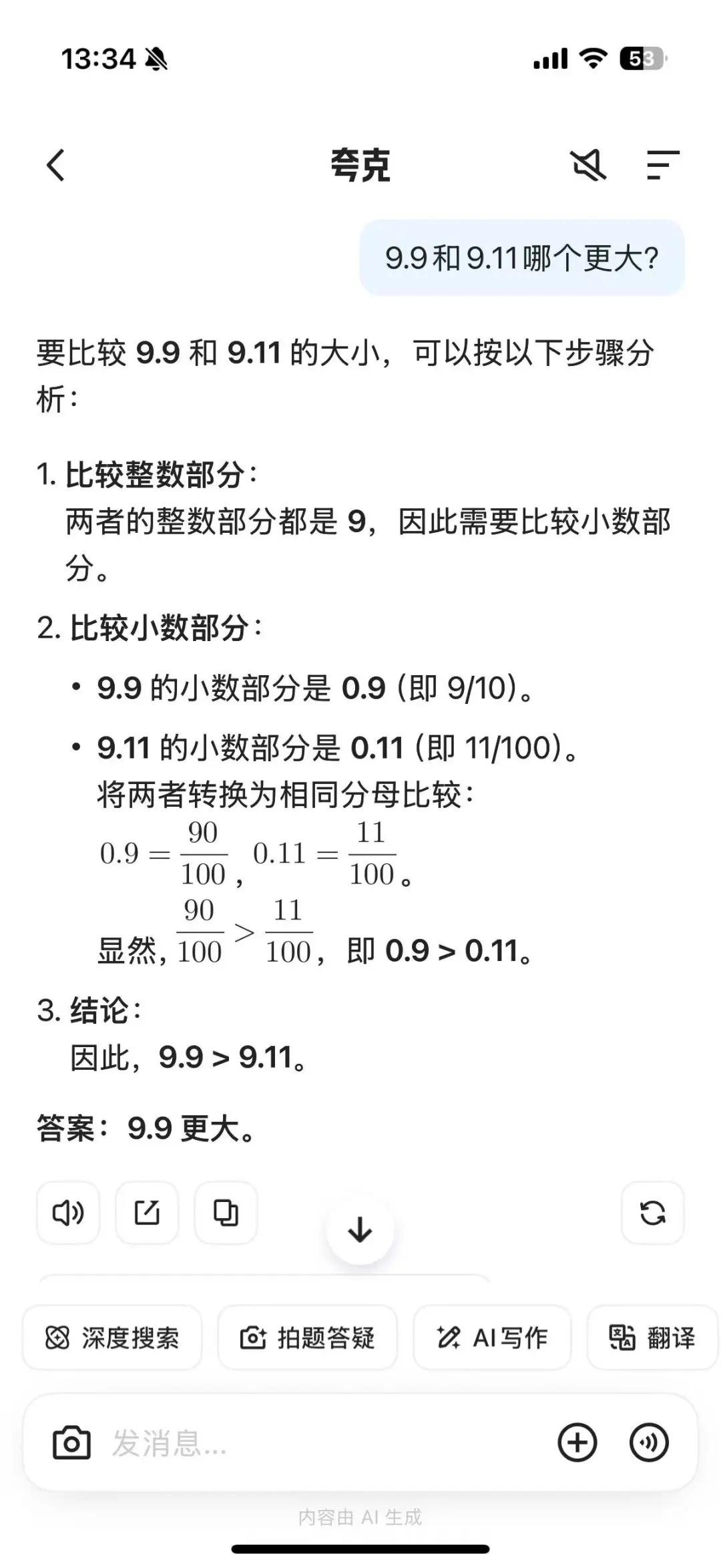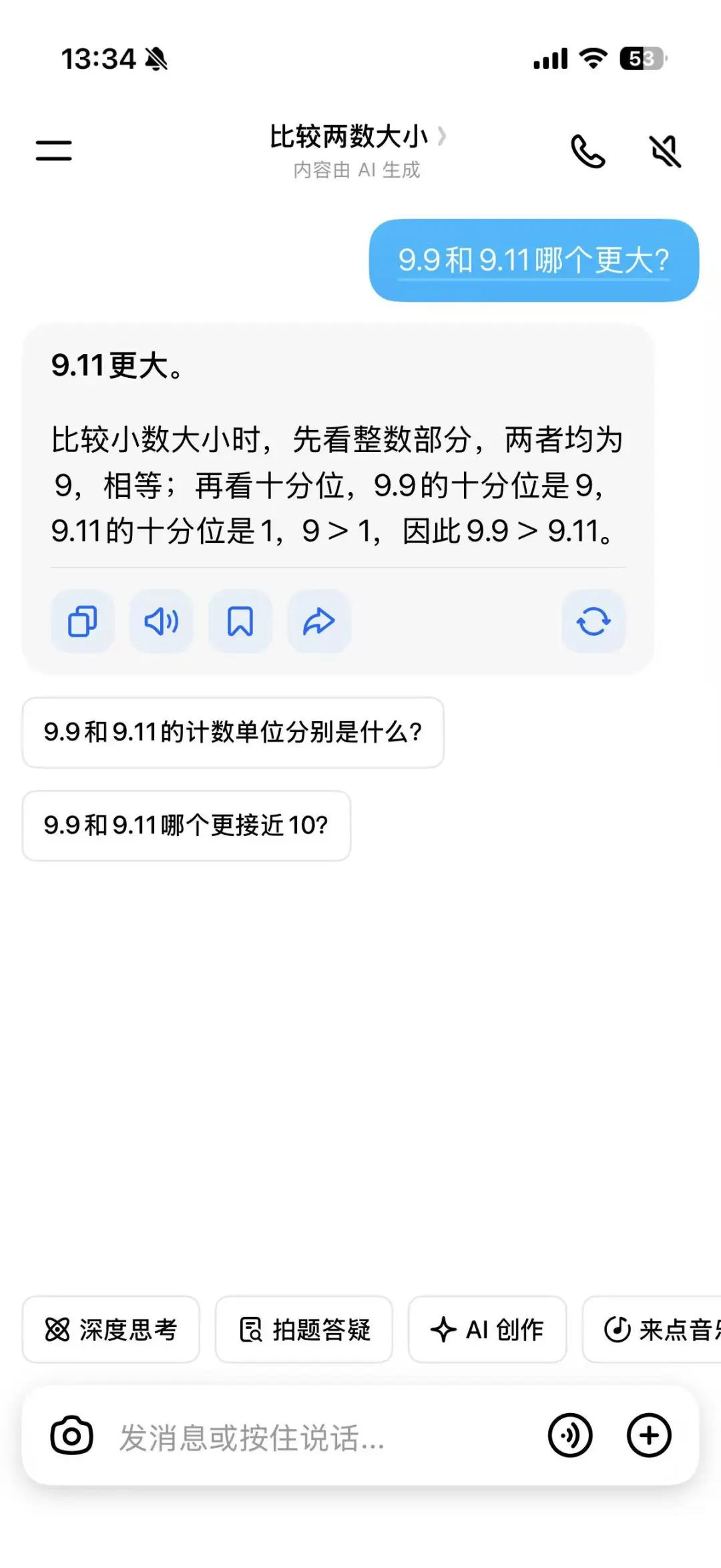 一些考验模型幻觉的经典陷阱问题,不同模型的回答就更有趣了。二者虽然都在运算过程中能准确分辨出9.9 比 9.11 大,但是豆包似乎陷入了左右互搏的窘境中,先给出 9.11 更大的判断,又在运算过程中解出 9.9 更大的结论。