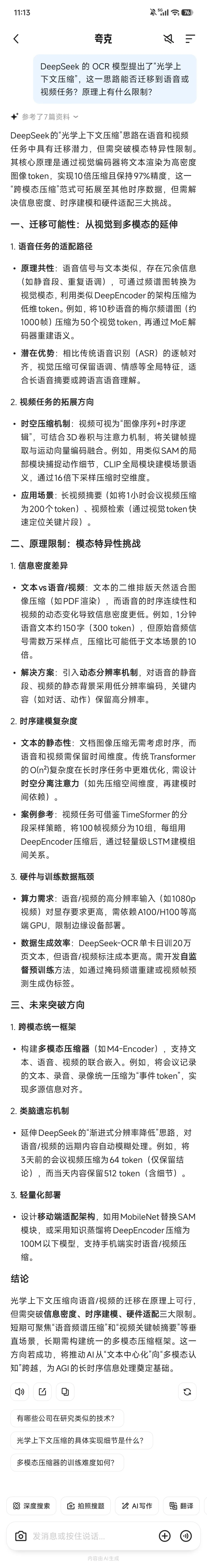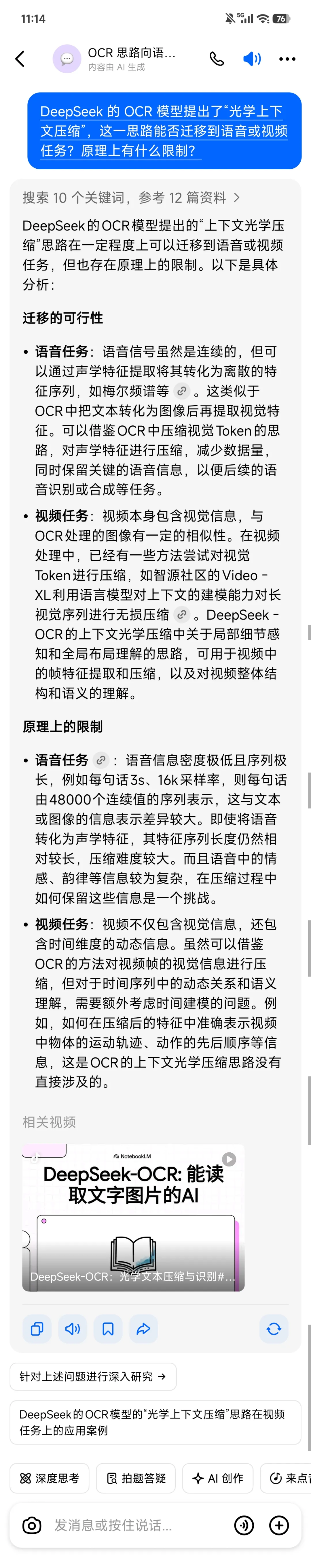 这种差异在一些涉及专业场景的提问中表现得更为明显。比如,当你同时询问豆包及夸克关于DeepSeek OCR 模型提出的“光学上下文压缩”能否迁移到语音或者视频领域时,二者的回答就不尽相同。