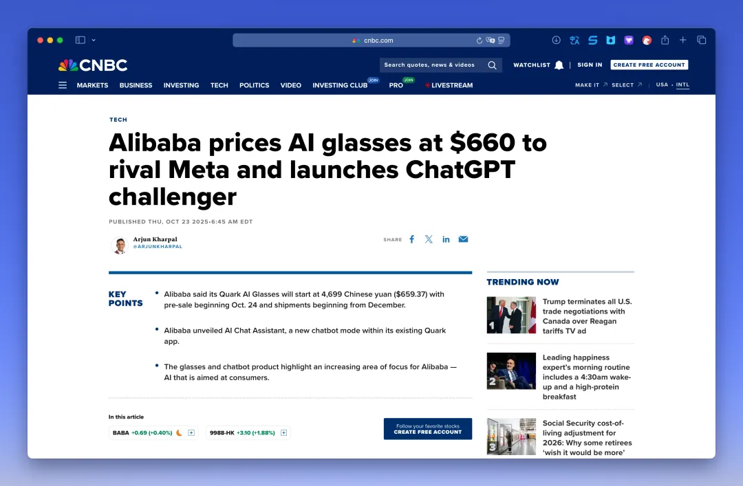 从这个角度上来说,夸克对手助手并不是豆包,更有点像国产化的ChatGPT。就连外媒 CNBC 的报道标题中,也直接说阿里巴巴推出了 ChatGPT 竞品——这是此前通义 App 都没享受到的待遇。