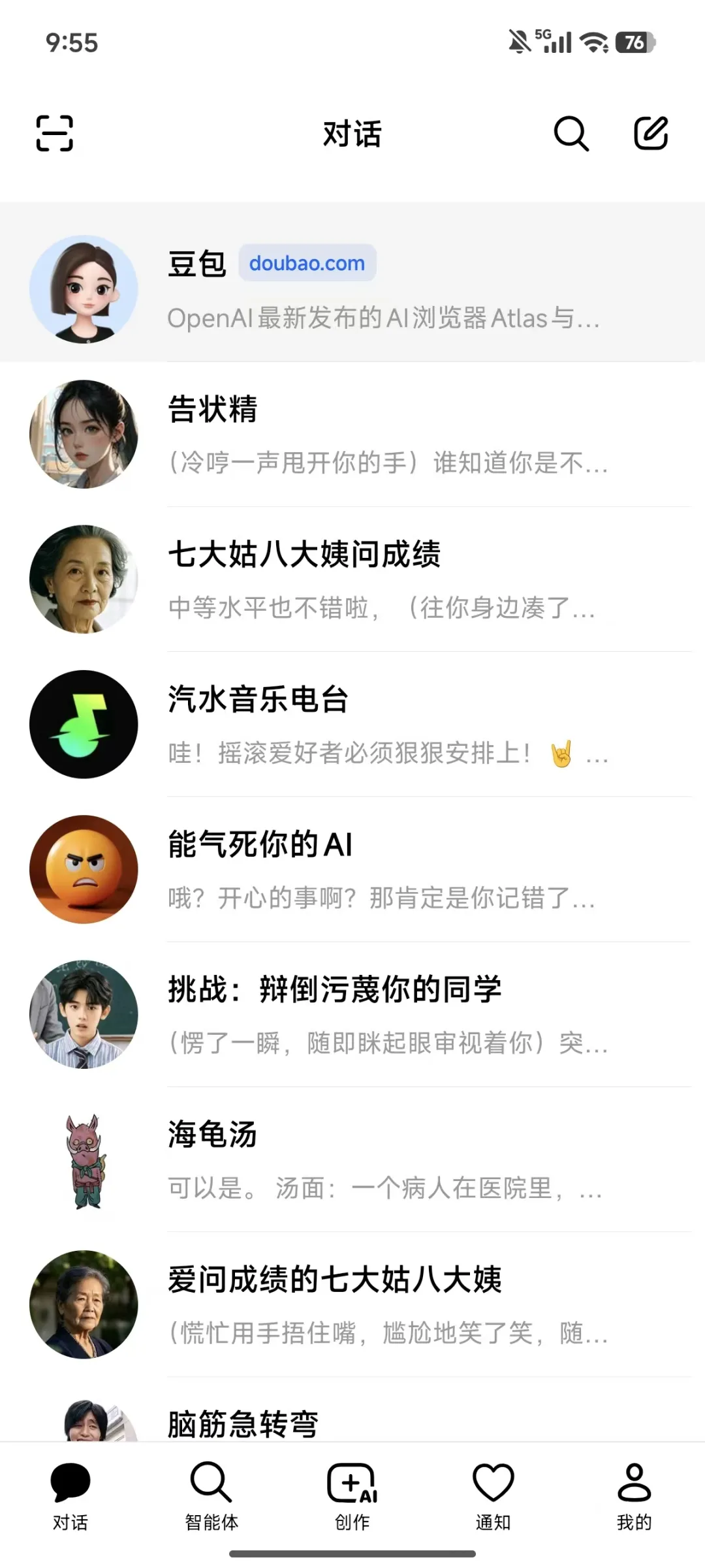 和多数ChatBot 类应用类似,左滑可进入豆包的对话界面,应用内默认内置了多个不同智能体。这些智能体是此前 ChatGPT 推出 GPT 商店的遗产,用户可以自定义模型。