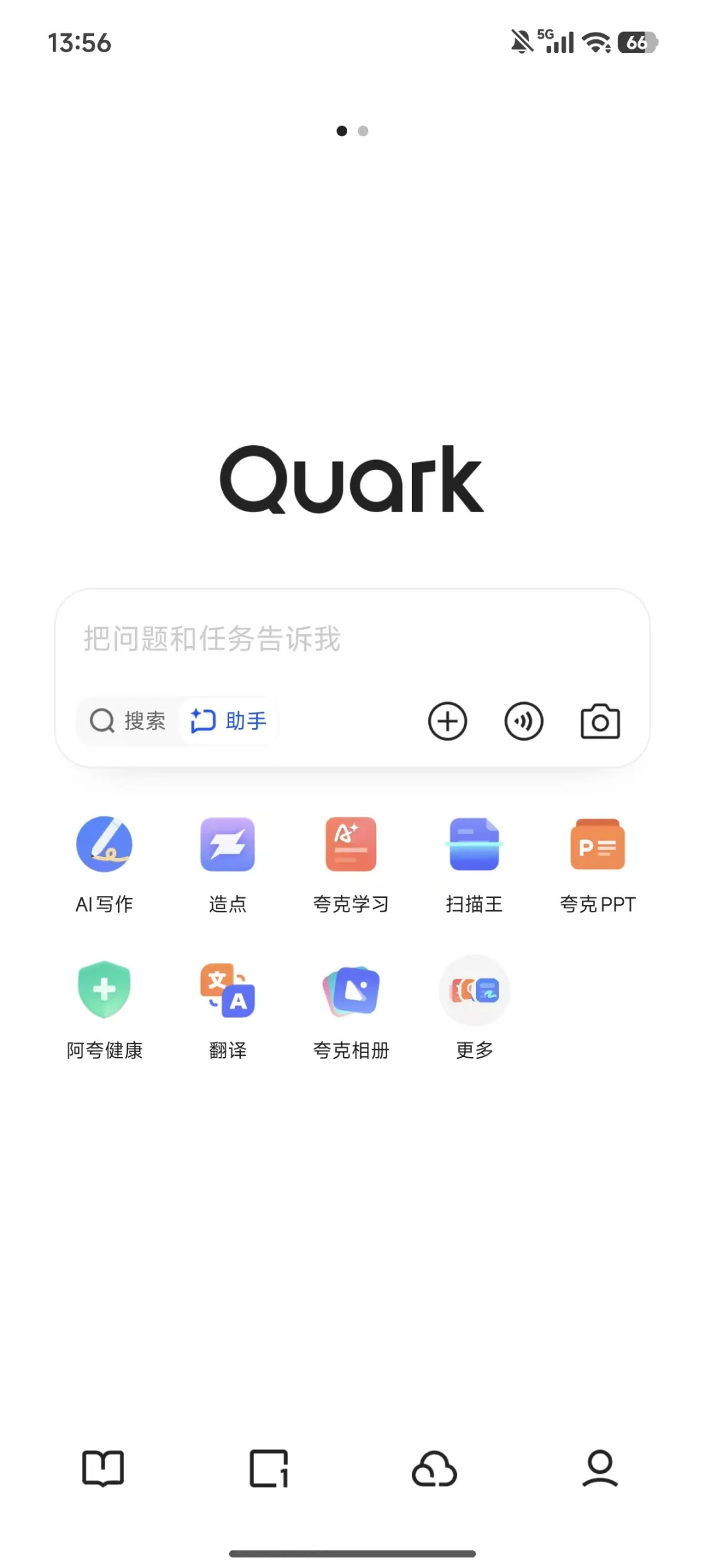 只是打开两款产品你就能一眼感受到差异。夸克并没有为对话助手新做一个App,它被整合进夸克原有的搜索框内,可以在搜索框下方点击“对话”切换,也可以直接在主页右滑切入。进入夸克对话助手,除了页面中间几个引导问题以及下方的输入框、常用效率工具之外,再无其他杂乱板块。
