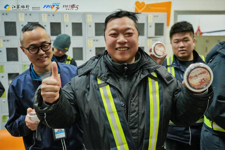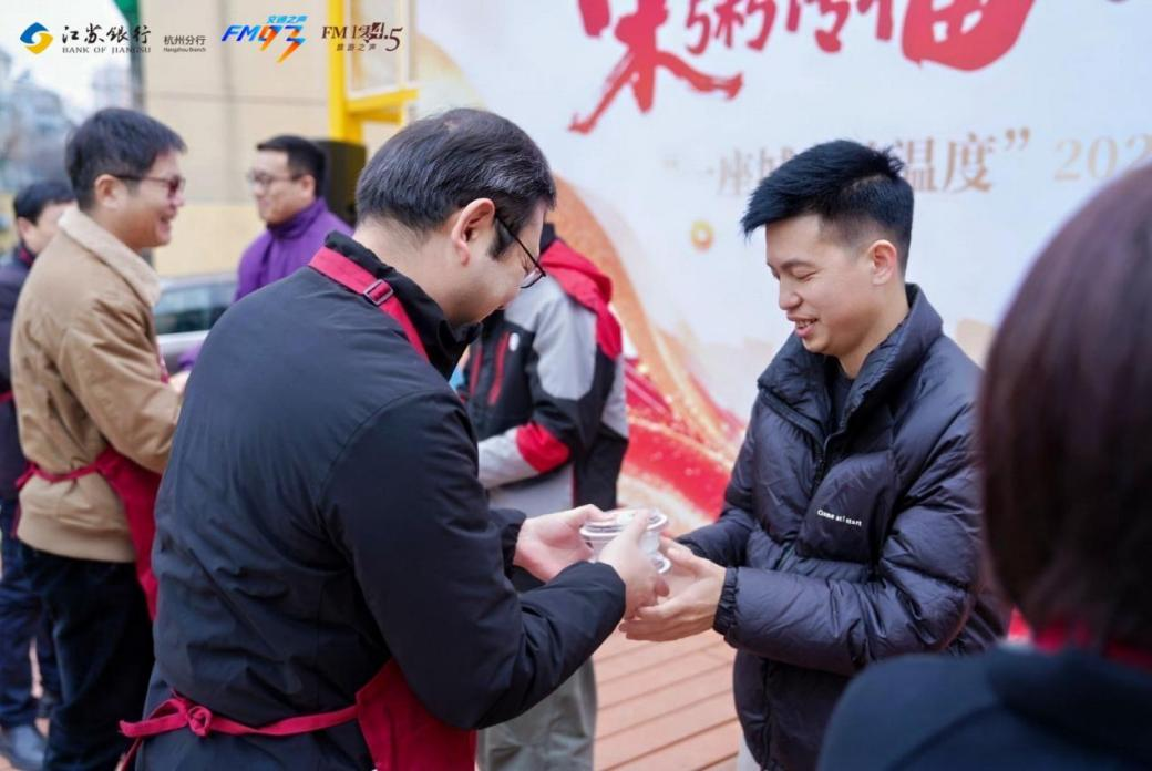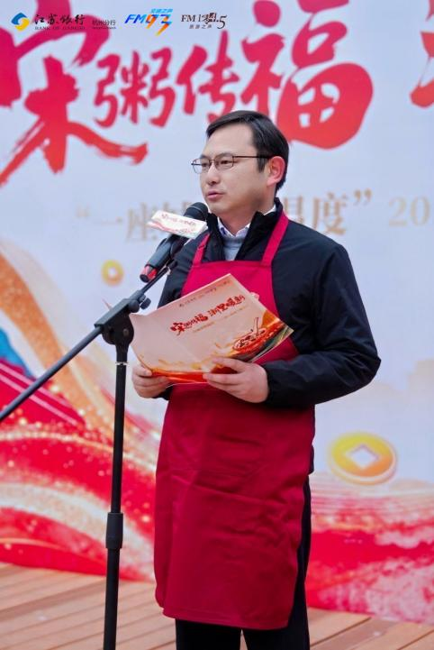 启动仪式上,江苏银行杭州分行党委委员、副行长管友健登台致辞,他表示,十二年的坚守,传递的不仅是一碗粥的温度,更是对城市服务者始终如一的敬意与关爱。随后,管友健副行长与浙江广电集团FM93交通之声副总监王兆峰、小河街道办事处副主任丁慧娜、小河街道董家新村社区党委书记钱宏伟共同登台,为四位特邀代表送上“宋韵福粥”,完成温暖传递仪式。“年关将至,我们每天忙着送年货,今天终于收到了属于自己的温暖祝福!”快递员代表捧着热粥动情说道,“这碗粥里有浙江的味道,更有被惦记的暖意,想送给自己和所有同行一句祝福:平安配送,万事‘粥’全!”