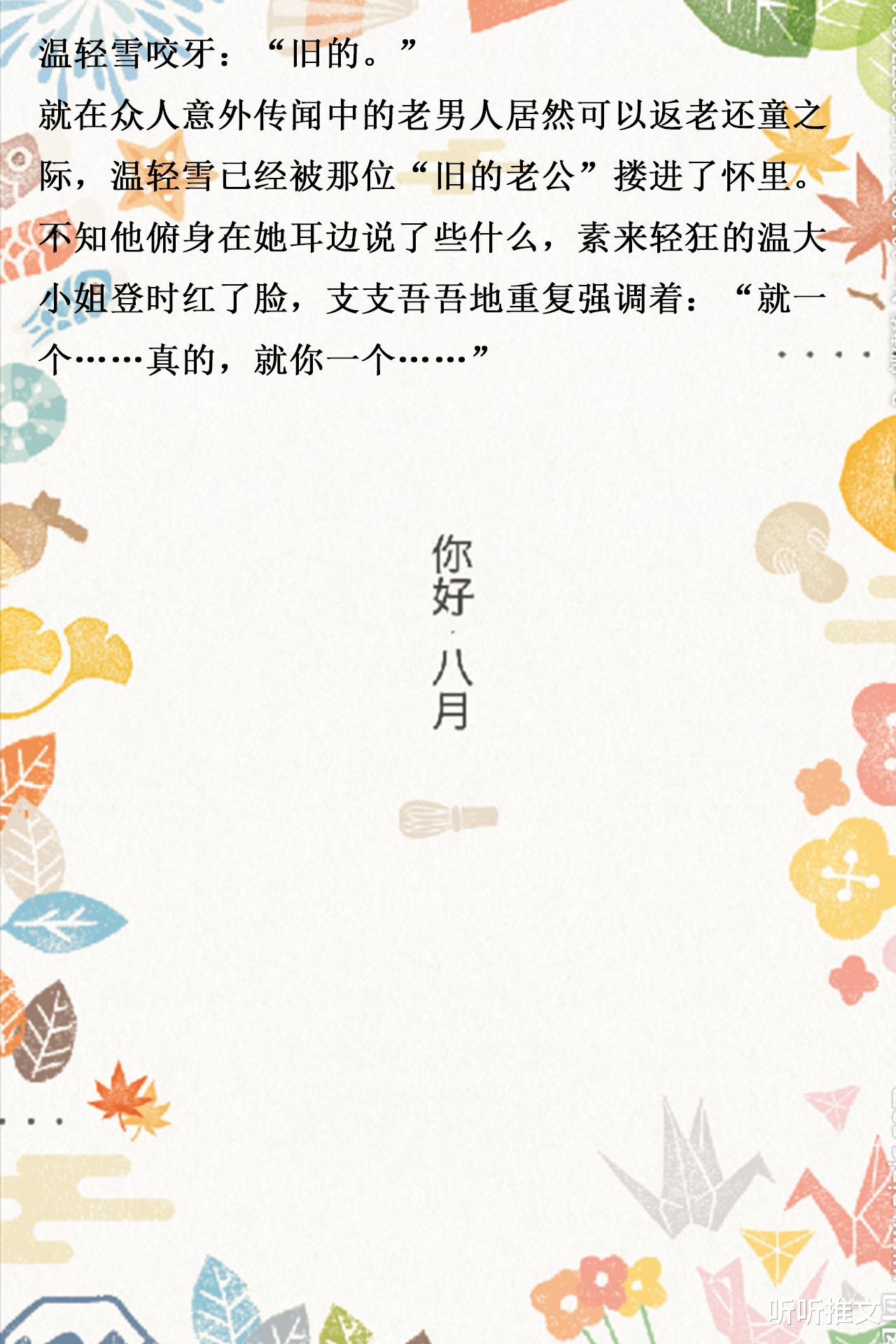 书评:温轻雪与生意场上呼风唤雨的商执结婚了,本就是商业联姻,温轻雪并没有报多大希望,只想着走个过场。没想到,二十多岁的商执在生活作风就像是七十多岁的老头子,不是养鱼养鸟,就是钓鱼写毛笔字,原本打算就这样各过各的,不耽误自己找乐子,谁料商执竟不想做塑料夫妻……本文设定俗中带新,情节紧凑丰富,主打先婚后爱,男女主婚后日常,语言幽默诙谐,男女主互动少女心爆棚,两人一路撒糖不断,男女主互相拿捏,是一篇不容错过的佳作,推荐阅读。