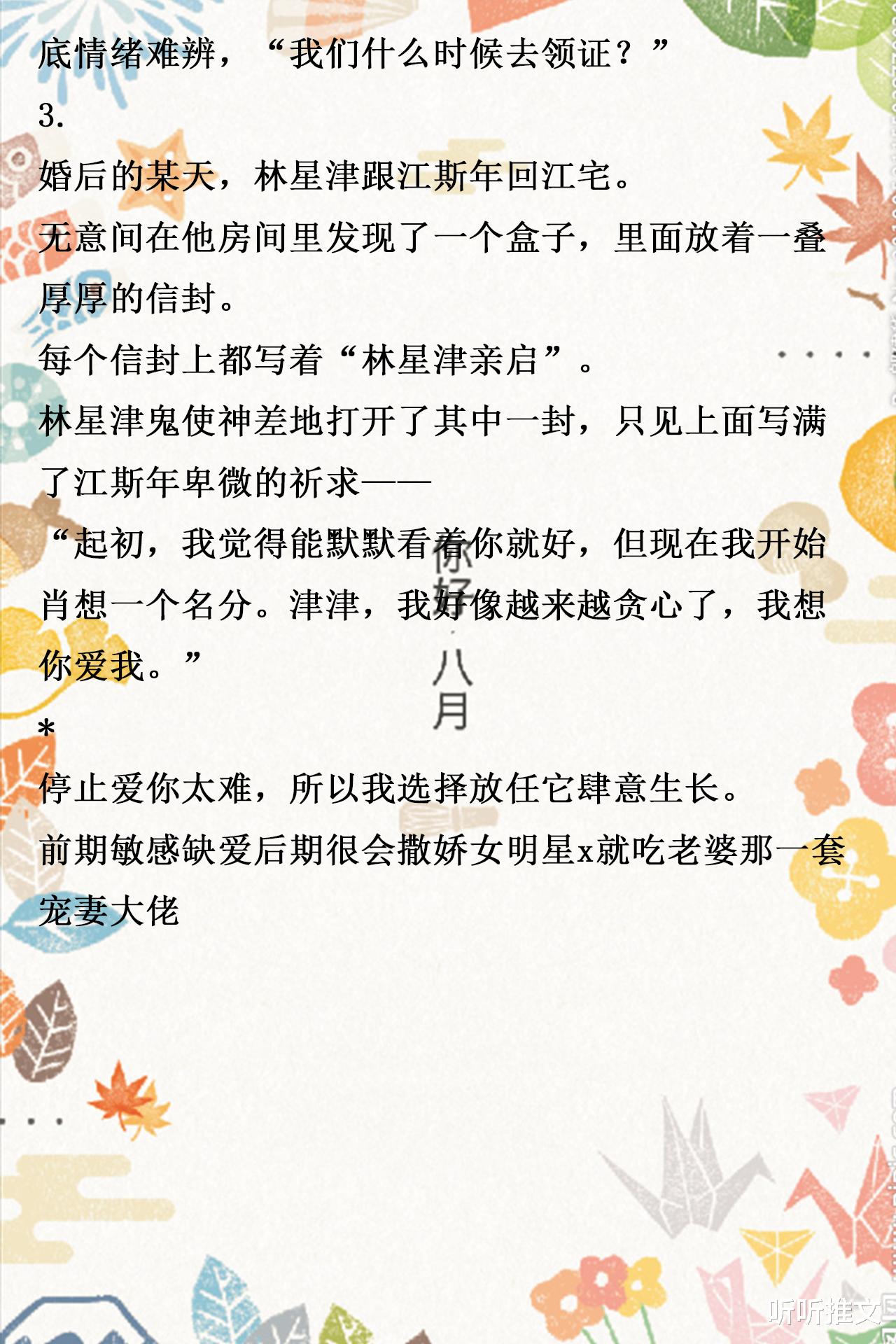 书评:为了摆脱父亲的控制,林星津主动找到还看的顺眼的江斯年合作联姻,然而她不知道,这对于江斯年来说求之不得。婚后两人友好相处,各忙各的,林星津一心发展娱乐圈事业,弥补母已逝母亲的遗憾,而江斯年在林星津身边默默守护。然而在相处中,两人还是彼此靠近,进而相知相爱,而林星津也逐渐发现了江斯年卑微又蓬勃的暗恋。