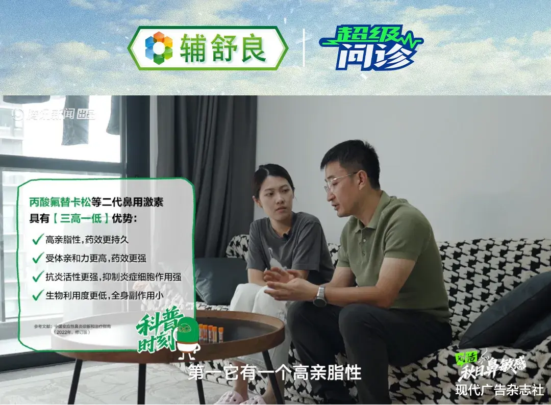 作为品牌方,也想通过《超级问诊》纪录片传递三大声音:第一,破除误区:明确“过敏不是小事”,区分过敏与感冒,消除“鼻用激素伤身”的认知偏差;第二,传递信心:通过“过敏原规避 + 环境控制 + 规范用药”的科学管理,实现“自由呼吸”;第三,强化品牌认知:辅舒良以专业方案陪伴患者,科学助力大家“直击鼻敏感,不负好秋日”。