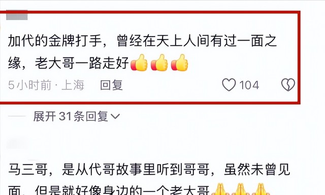 有位名为“十三先生”的网友应该也是在场兄弟中的一员,简单说了句“马三哥一路走好。”