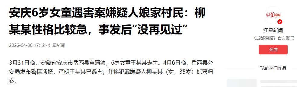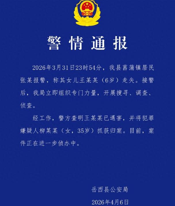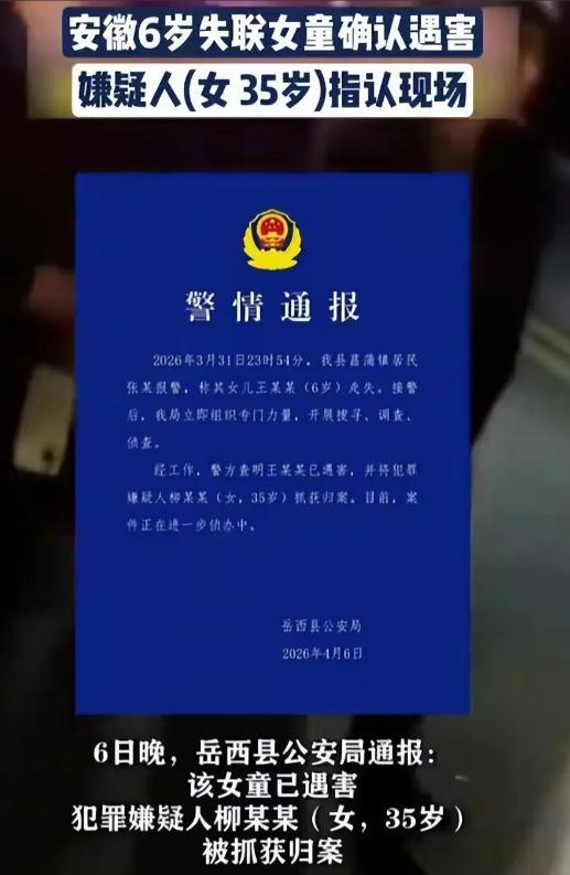 4月6号晚上,岳西县公安局正式发了警情通报,所有人最不愿看到的结果,还是来了:6岁的佩佩已经遇害,犯罪嫌疑人就是35岁的柳某某,已经被警方抓获归案。