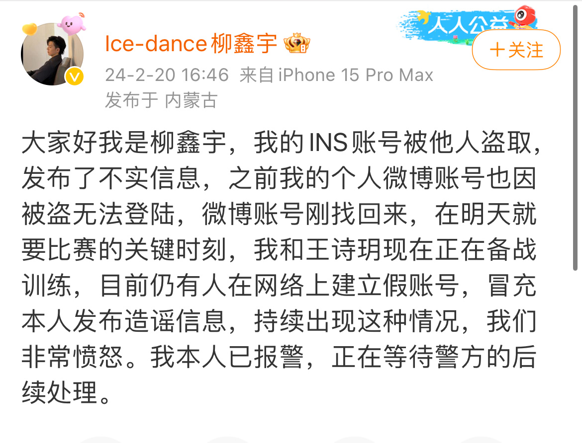 随后,柳鑫宇本人终于发声了,他在社媒上写道:我的ins账号被他人盗取,发布了不实信息,之前我的个人微博账号也因被盗无法登录,微博账号刚找回来。在明天就要比赛的关键时刻,我和王诗玥现在正在备战训练。目前,仍有人在网络上建立假账号,冒充本人发布造谣信息,持续出现这种情况,我们非常愤怒,我本人已报警,正在等待警方的后续处理。