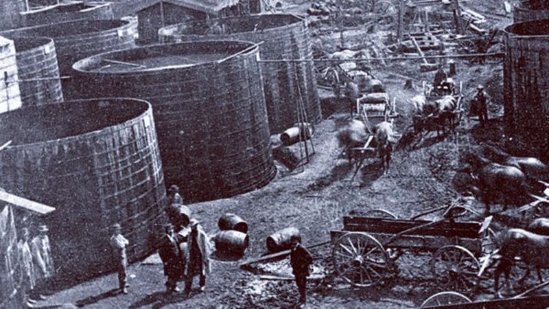话说在19世纪中叶,美国加西法尼亚州石油工业刚刚开始兴起。油井边的场面一度混乱,壮汉们随手拿到一个容器,就开始装石油。比如威士忌桶,腌咸鱼的桶,装啤酒的桶等等。