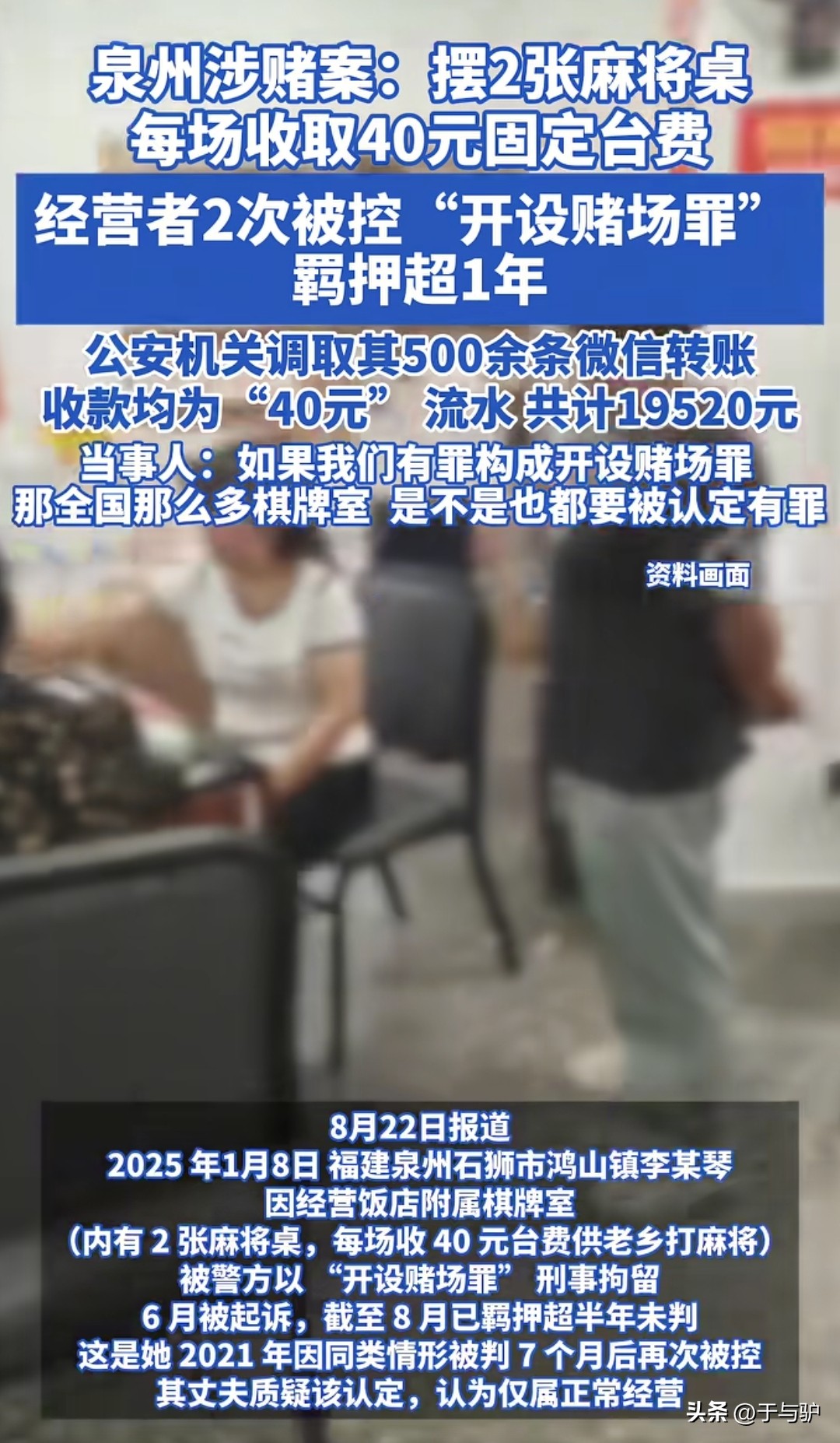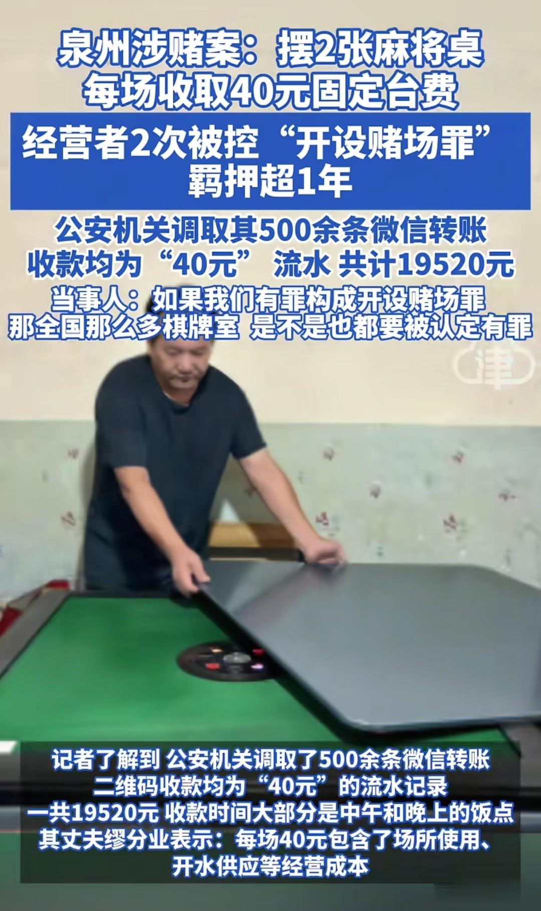 津云报道,福建泉州石狮市洪山镇李女士因经营饭店附属棋牌室,棋牌室里面仅有两张麻将桌,老乡们来打麻将固定收40元台费,被当地公安在2025年1月8日查处,并且以“开设赌场罪”刑事拘留。