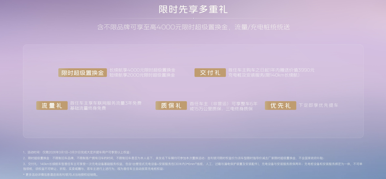据悉,在3月期间大定并提车,除了7.78万起的限时权益价,还有长续航车型可享4000元超级置换补贴,短续航车型享2000元补贴;首任车主还能免费领取充电桩及安装服务,同时享受三电终身质保等诸多权益。