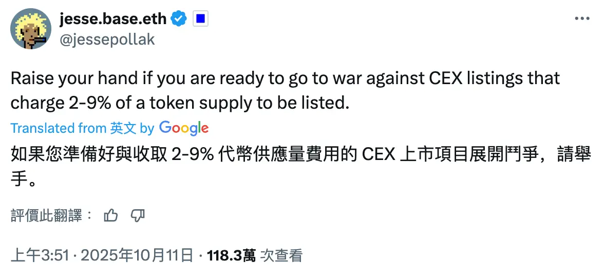 10 月 11 日 Base 创始人 Jesse Pollak 在 X 上连发贴文,批评部分中心化交易所向项目方收取 2% 至 9% 代币供应量作为上币费。