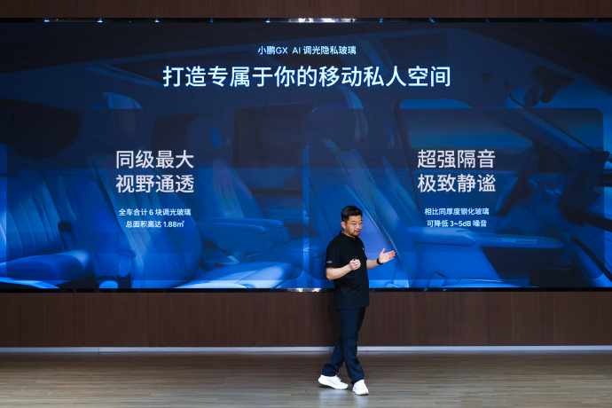 此外,小鹏GX全车共搭载了6块这样的AI调光玻璃,总面积高达1.88㎡,为同级领先。配合5层夹胶结构和专用隔音膜片,相比普通钢化玻璃还能降低3-5分贝的噪音,进一步提升了座舱的静谧性。