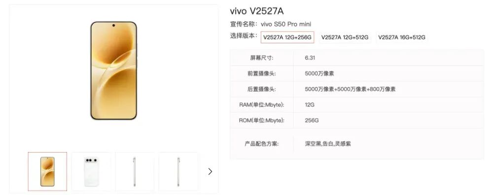 vivo S50 Pro mini型号为V2527A,配备6.31英寸屏幕,2640*1216分辨率,前置5000万像素自拍镜头,后置5000万像素、5000万像素、800万像素镜头组合。