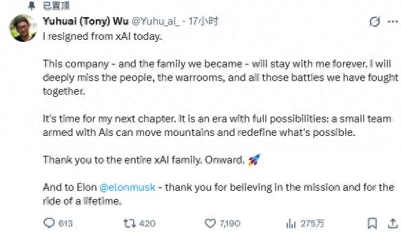 DoNews2月11日消息,当地时间周一晚间,xAI 联合创始人 Tony Wu 宣布离职。他在深夜发布的 X 推文里写道:“是开启我人生新篇章的时候了。这是一个充满无限可能的时代:一支手握人工智能的小团队,足以移山填海,重新定义何为可能。”