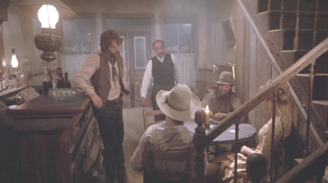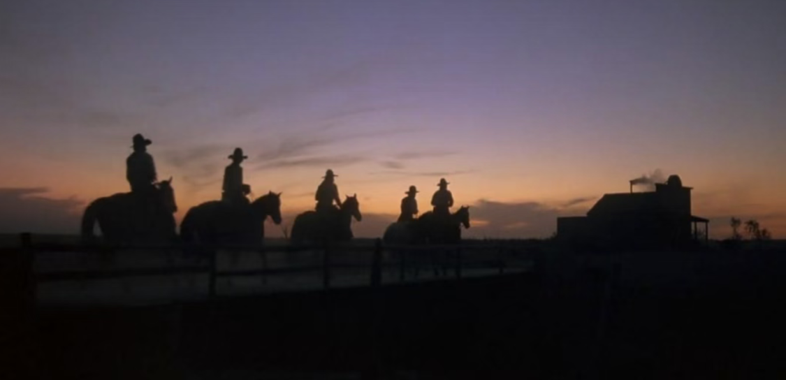 牛仔替代侠客,左轮手枪代替刀剑,荒野大地就是快意恩仇的江湖。格斯和考尔俨然一对迟暮侠客,在落日余晖下策马远去
