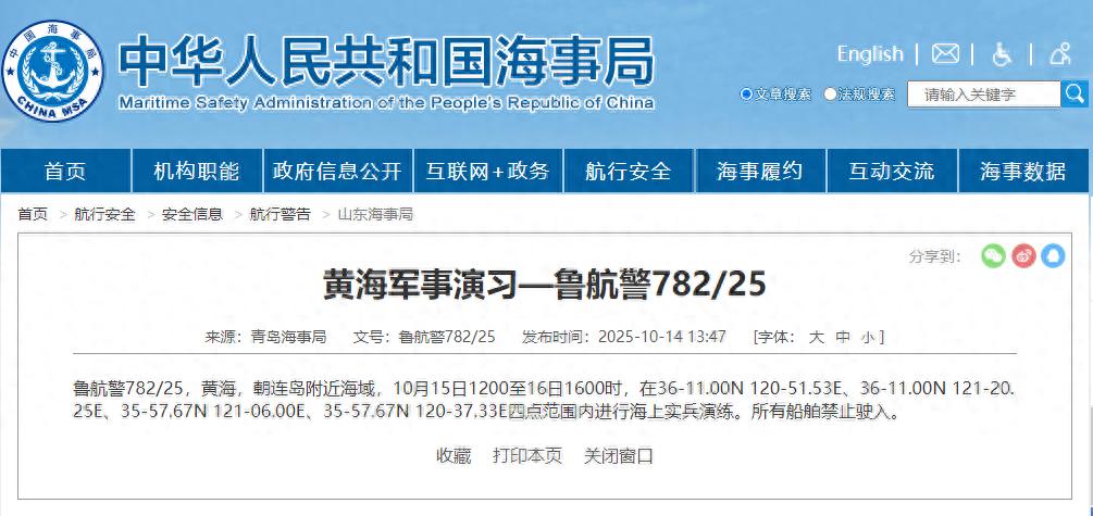 据中国海事局网站消息,青岛海事局发布航行警告,10月15日12时至16日16时,黄海朝连岛附近海域进行海上实兵演练,所有