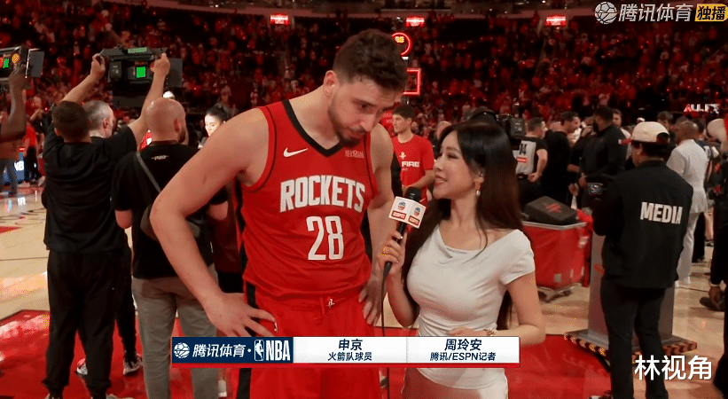 比赛结束,本场比赛表现不错的申京在场边接受记者采访。