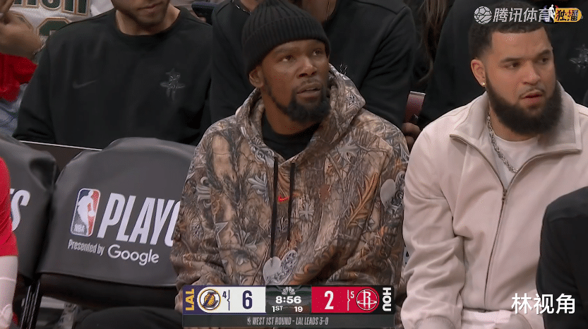 杜兰特今天坐在替补席为球队加油助威,可以看出心情也是很沉重。