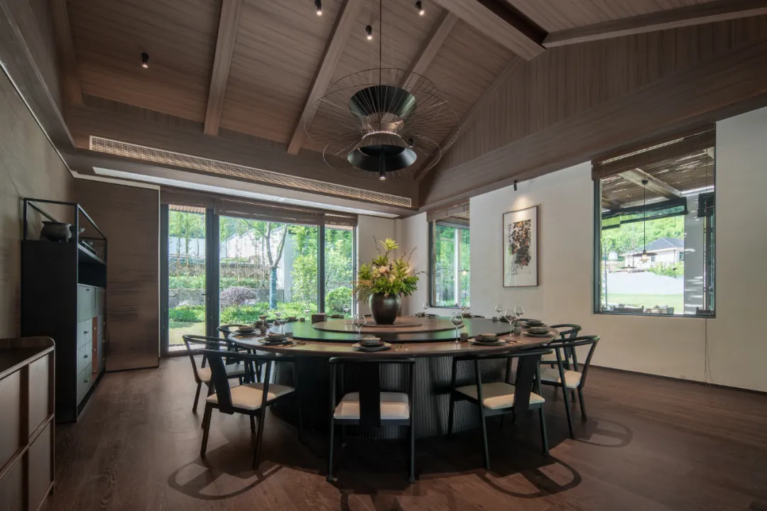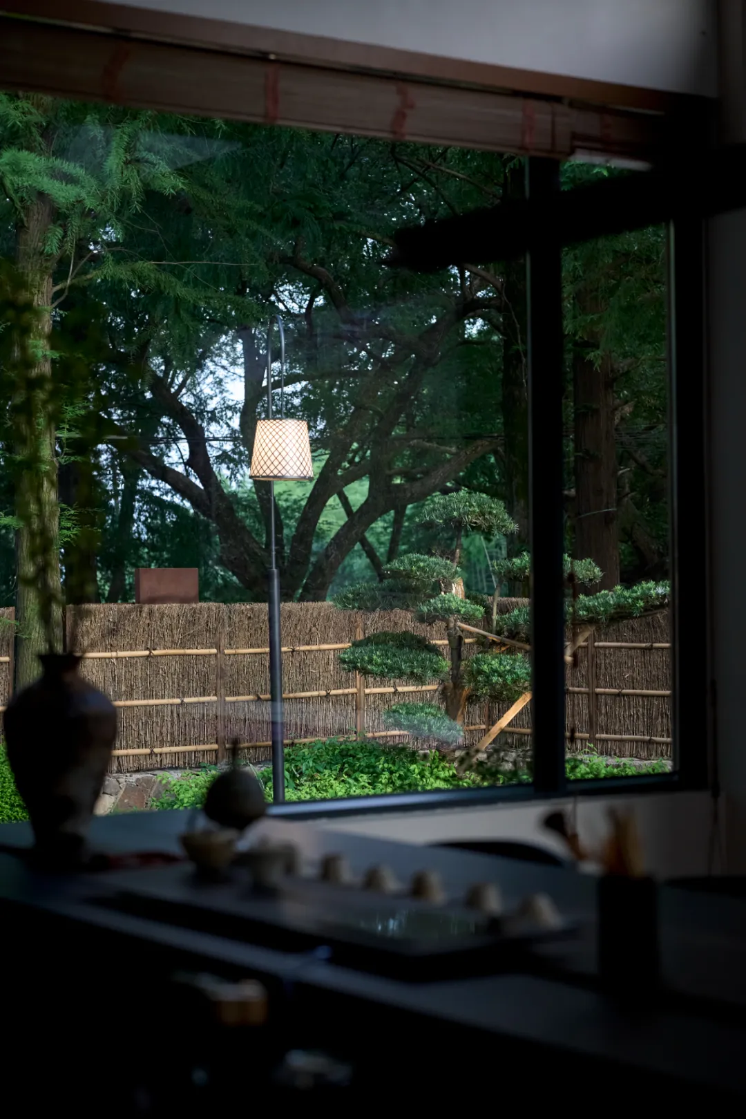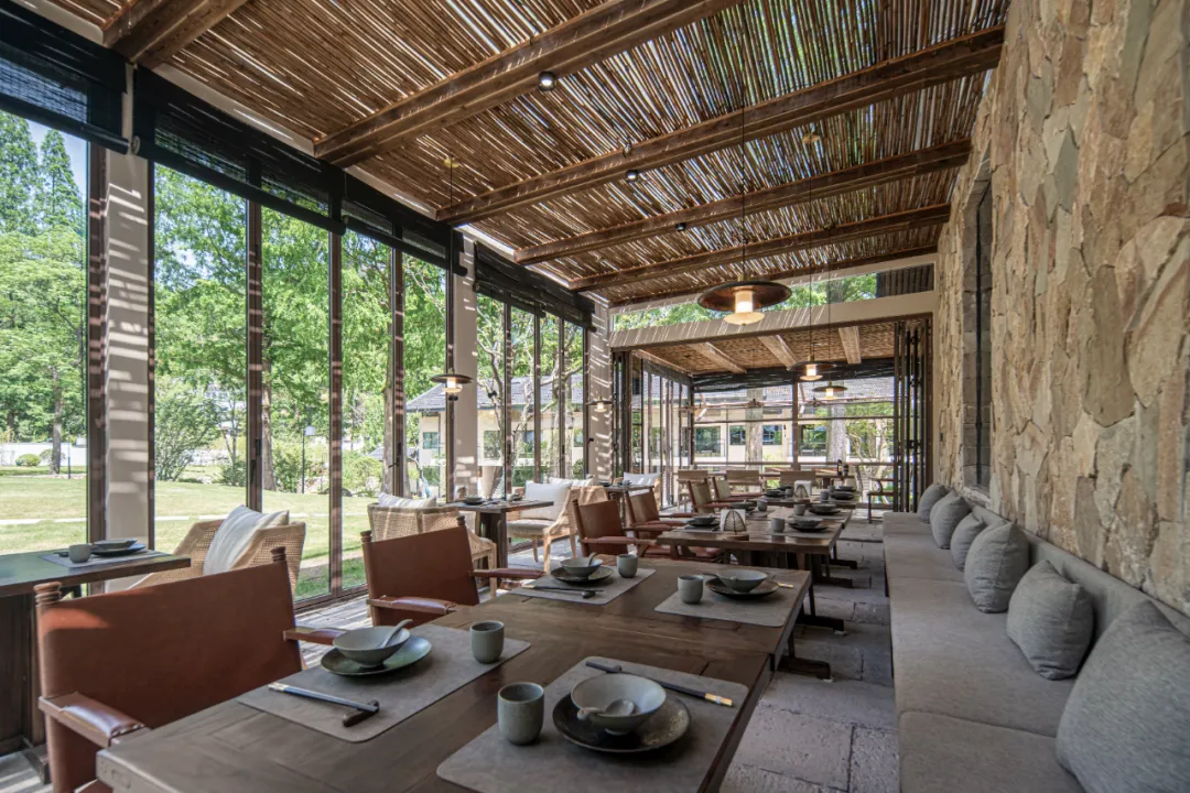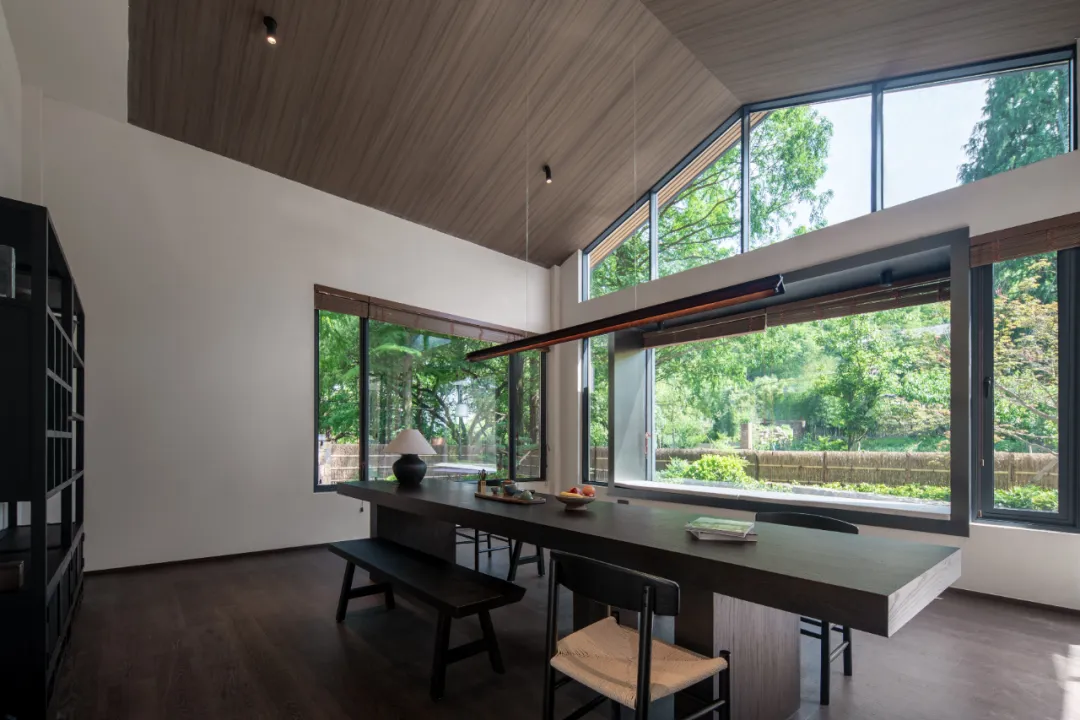 餐厅的光影更是一绝。一面是粗砺的石墙,一面是可开合的全景落地玻璃打开之后便是郁郁葱葱的庭院,天花板是由成排的短竹构成。