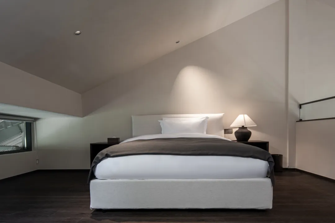 二楼的双阳台大床房与庭院大床房相似,不过房间顶部挑高且设有窗户,充足的自然光线酒进室内。深色木地板搭配浅色墙壁,还搭配着深色木质柜与白色沙发,优雅低调。