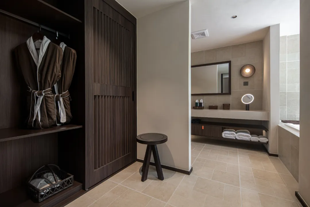 良渚店以无界松弛为理念,打造疗愈松弛的度假空间只有AB两栋楼,主楼为客卧区。整个建筑好似在光影间写诗,外墙夯土色肌理透着自然温润的触感,粗粝的肌理里好似藏着良渚先民制陶的手纹。恍惚间五千年的光阴忽然变得可触可感。