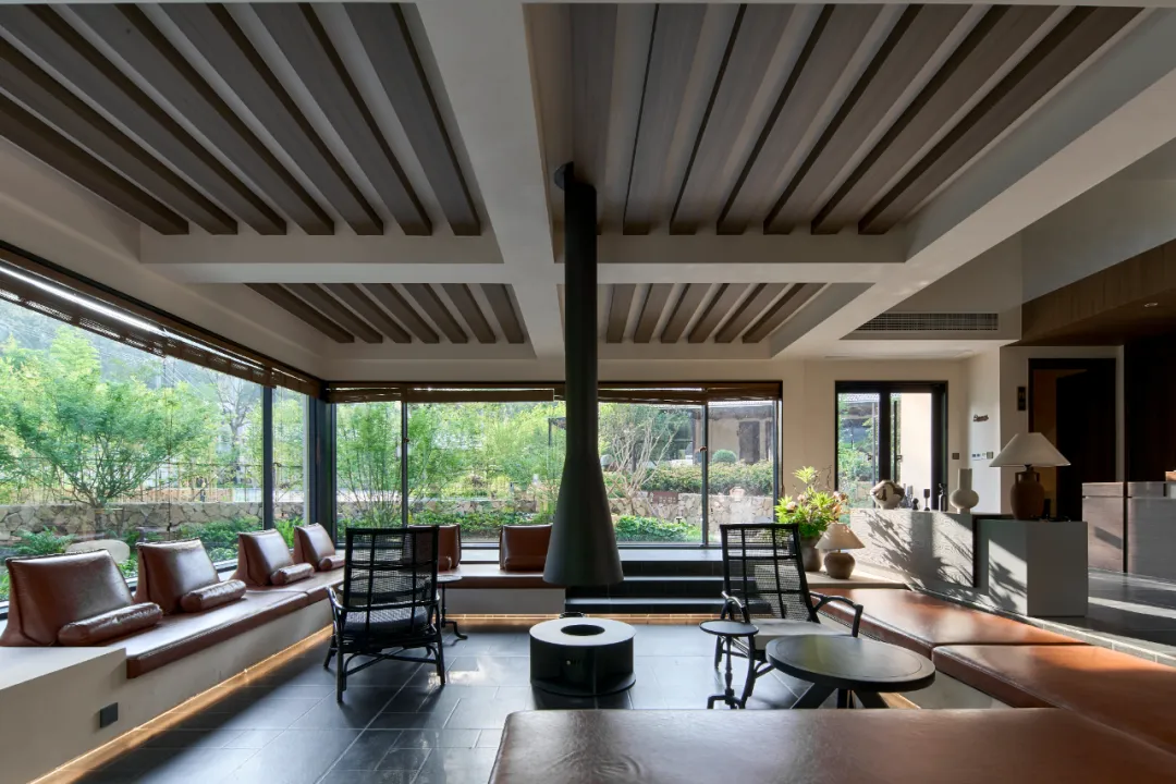 一旁的休闲区沿用了同样的设计感。光影斑驳,木质合叶的吊灯更显质朴自然。打开半开合的玻璃窗,风就进来了,水杉叶也进来了。嗯,已经可以想象到与三俩好友一起坐在这喝下午茶的惬意时光。