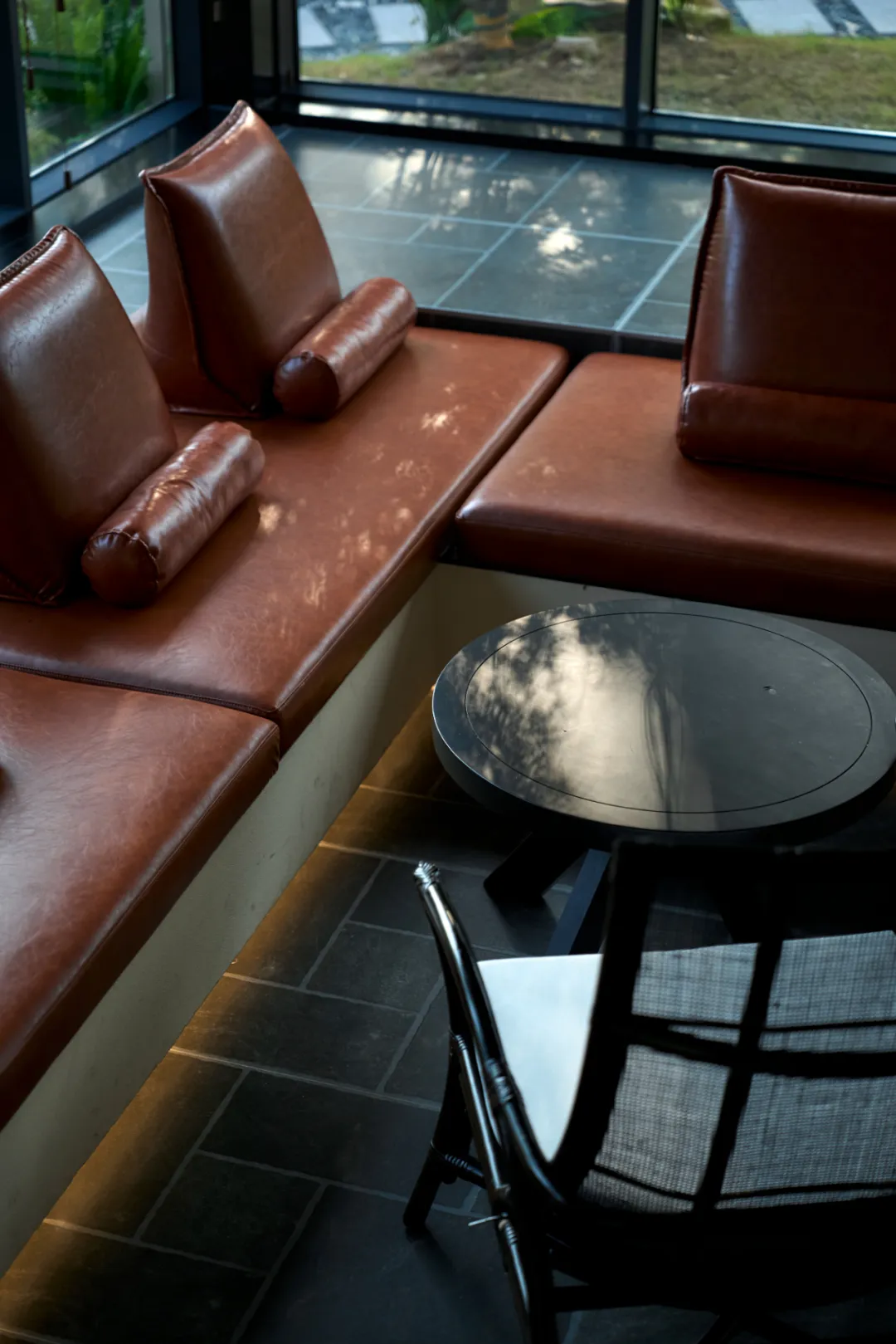 大堂正中间做了下沉式的会客设计,很适合与朋友一起围坐闲谈。客厅内摆放着棕色皮质沙发和座椅,搭配了黑色茶几,背景墙上方有木质格栅,增添了自然的元素。高中低三种不同层次的灯光设计,使得整体室内空间更显出温馨舒适的氛围。