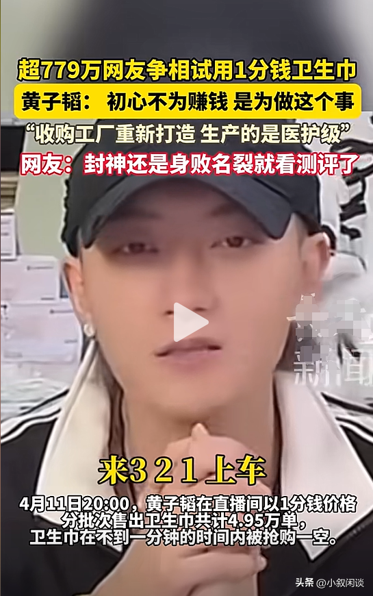 当黄子韬把这4.95 万单试用卫生巾销售一空时,有网友说到,封神还是身败名裂就看实际测评了!希望他的产品能够测评达到他所说的标准,要不然可就难收场了。