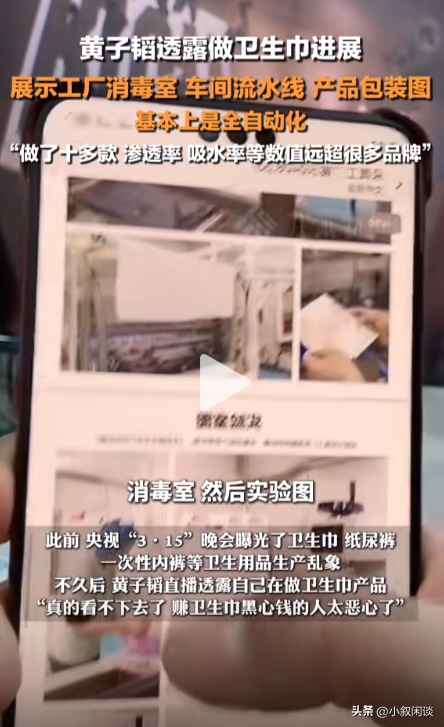因此前有媒体曝光市场上卫生巾生产的乱象,不久后,黄子韬曾在直播中说到“那些赚卫生巾黑心钱的人真的太恶心了”,他决心要打造透明化卫生巾工厂。